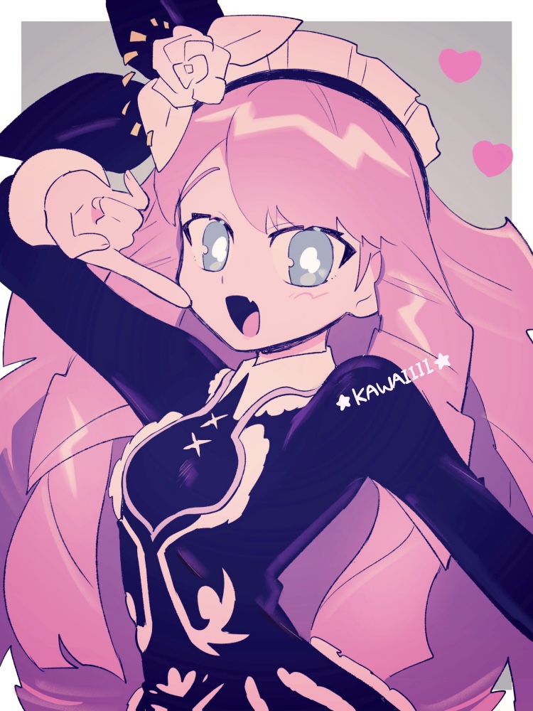 1girl :d a_(poipiku_325815) black_dress blue_eyes blush breasts collar collared_dress commentary_request dress drill_hair fang finger_to_cheek flower hair_flower hair_ornament hairband hand_up heart long_hair long_sleeves looking_at_viewer marbas_(megido72) megido72 open_mouth pink_hair rose small_breasts smile solo upper_body white_collar white_flower white_hairband white_rose