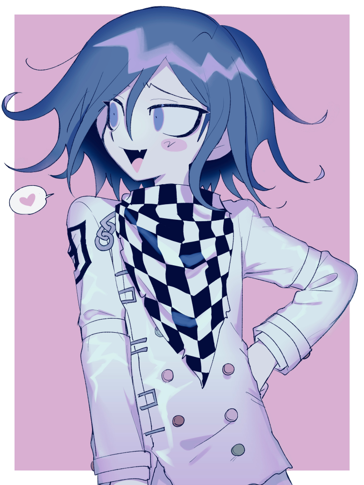1boy :d a_(poipiku_325815) border checkered_clothes checkered_scarf commentary_request danganronpa_(series) danganronpa_v3:_killing_harmony fang hair_between_eyes heart jacket long_sleeves looking_to_the_side male_focus oma_kokichi open_mouth pink_background purple_eyes purple_hair scarf short_hair smile solo spoken_heart straitjacket upper_body white_border white_jacket