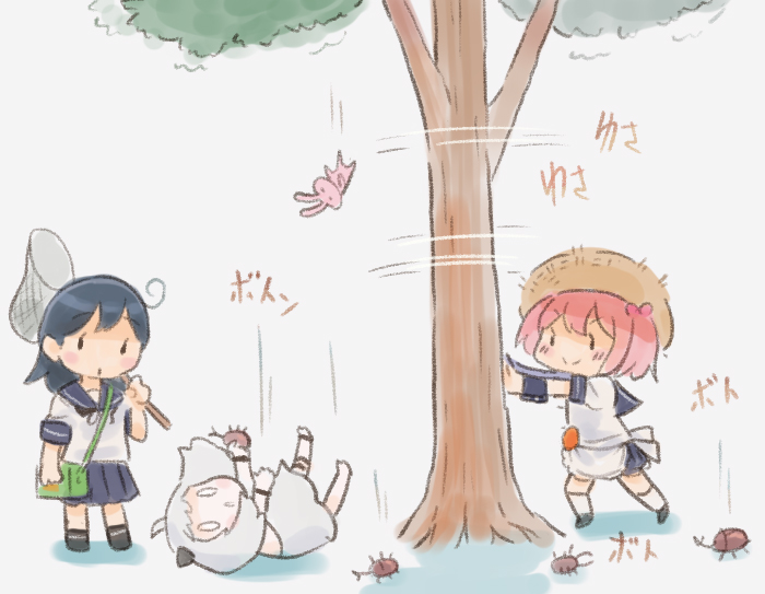 2girls apron black_hair black_sailor_collar black_skirt box bug butterfly_net cicada hand_net hat insect kantai_collection long_hair multiple_girls northern_little_sister pink_eyes pleated_skirt pushing rabbit saiguchi_otoufu sailor_collar sailor_shirt sazanami_(kancolle) sazanami_kai_(kancolle) school_uniform serafuku shaking shirt short_hair skirt standing straw_hat sun_hat tree twintails ushio_(kancolle) white_apron white_hair