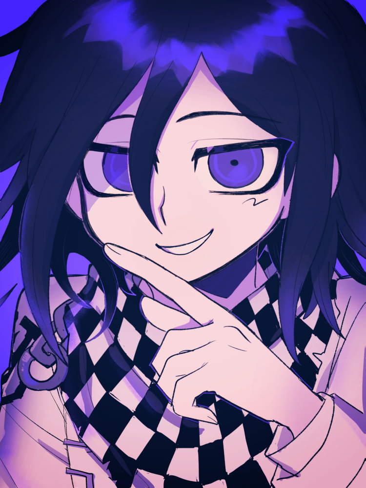 1boy a_(poipiku_325815) black_hair checkered_clothes checkered_scarf commentary_request danganronpa_(series) danganronpa_v3:_killing_harmony hair_between_eyes hand_up jacket long_sleeves looking_at_viewer male_focus oma_kokichi open_mouth purple_eyes scarf short_hair simple_background smile solo upper_body white_jacket