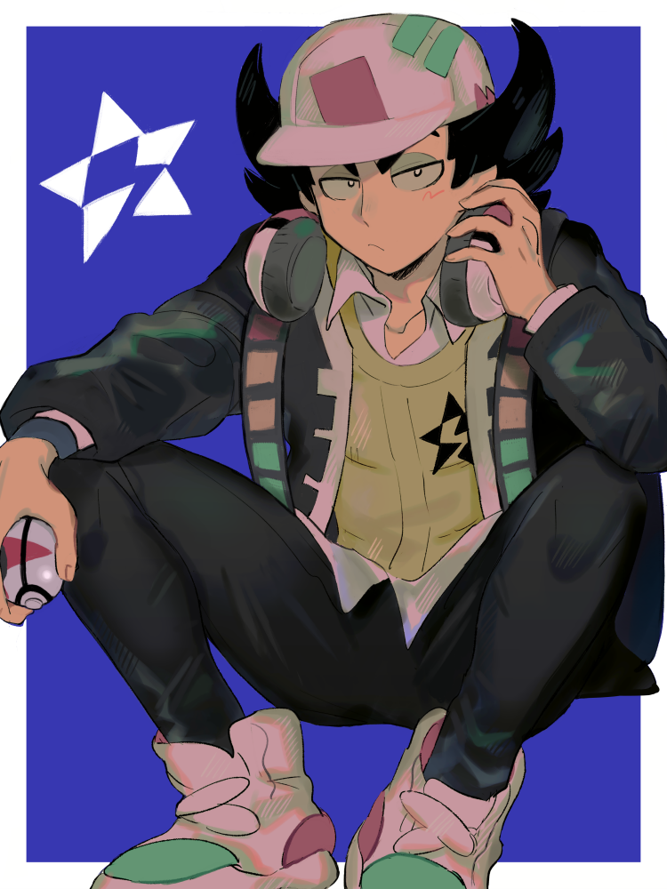 1boy a_(poipiku_325815) baseball_cap black_hair black_jacket black_pants blue_background border closed_mouth collared_shirt commentary_request flipped_hair giacomo_(pokemon) hand_on_headphones hand_up hat headphones headphones_around_neck holding holding_poke_ball jacket knees_up long_sleeves looking_at_viewer male_focus nintendo open_clothes open_jacket pants poke_ball pokemon pokemon_sv shirt shoes short_hair sitting sneakers solo sweater white_border white_hat white_shirt white_shoes yellow_sweater