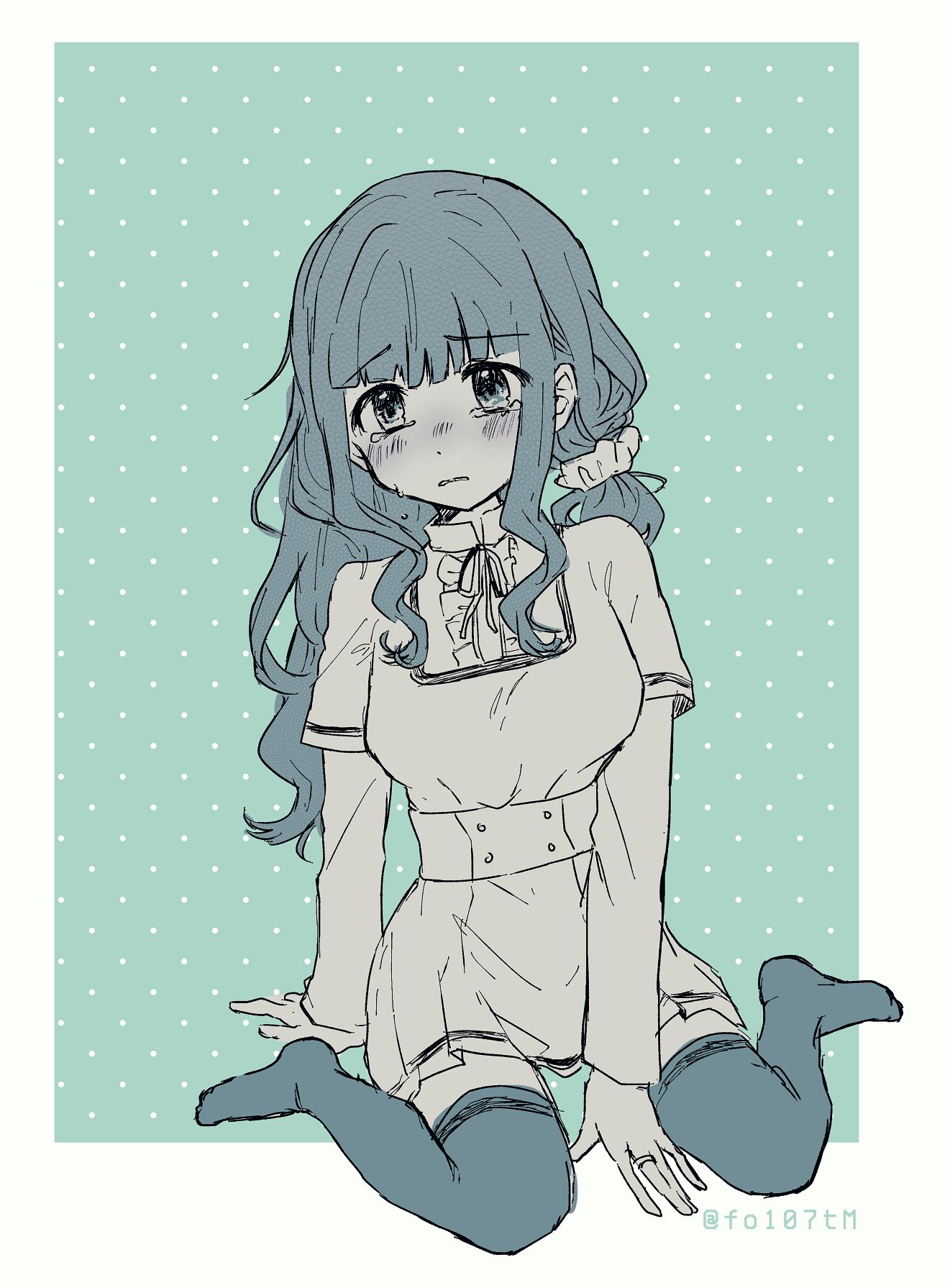 1girl aqua_background arm_rest between_legs blunt_bangs blush border buttons center_frills collared_shirt crying crying_with_eyes_open frilled_shirt frills futaba_sana hair_half_undone hair_ornament hair_scrunchie hand_between_legs highres layered_sleeves long_hair long_sleeves magia_record:_mahou_shoujo_madoka_magica_gaiden mahou_shoujo_madoka_magica miniskirt mizuna_girls'_academy_school_uniform neck_ribbon no_shoes pleated_skirt polka_dot polka_dot_background ribbon school_uniform scrunchie shirt shirt_under_shirt short_over_long_sleeves short_sleeves sidelocks sitting skirt solo spot_color tears thighhighs totte twitter_username wariza wavy_hair wavy_mouth white_border