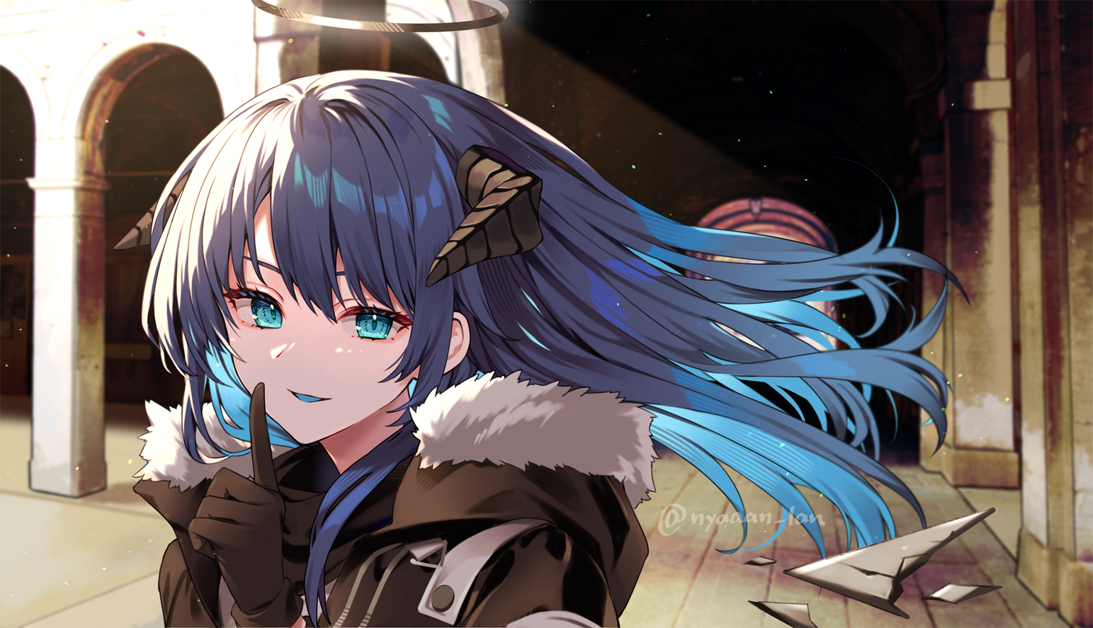1girl arch arknights black_gloves black_jacket black_wings blue_eyes blue_hair blue_tongue colored_tongue dark_halo demon_horns detached_wings energy_wings finger_to_mouth floating_hair fur-trimmed_jacket fur_trim gloves halo hand_up horns index_finger_raised jacket looking_at_viewer mashita_(kuzsat) mostima_(arknights) outdoors portrait shushing solo wind wings