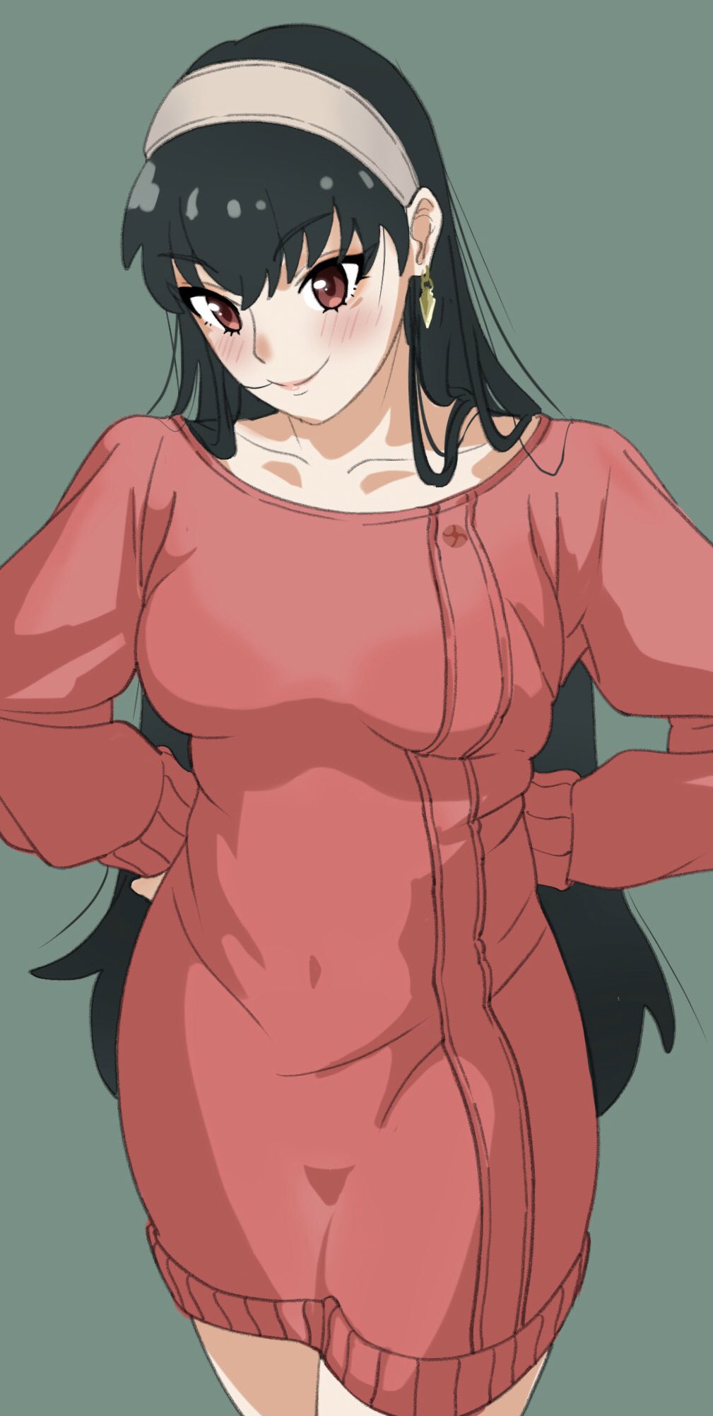 1girl black_hair blush breasts brown_eyes cleavage closed_mouth collarbone cowboy_shot dress earrings hair_between_eyes hair_ornament hairband hands_on_own_hips highres jewelry long_hair long_sleeves looking_at_viewer makkori_(utoxrjimlx8x49s) medium_breasts missing_legwear off-shoulder_sweater off_shoulder open_mouth pajamas_challenge_(meme) red_sweater ribbed_sweater simple_background smile solo spy_x_family standing sweater sweater_dress white_hairband yor_briar