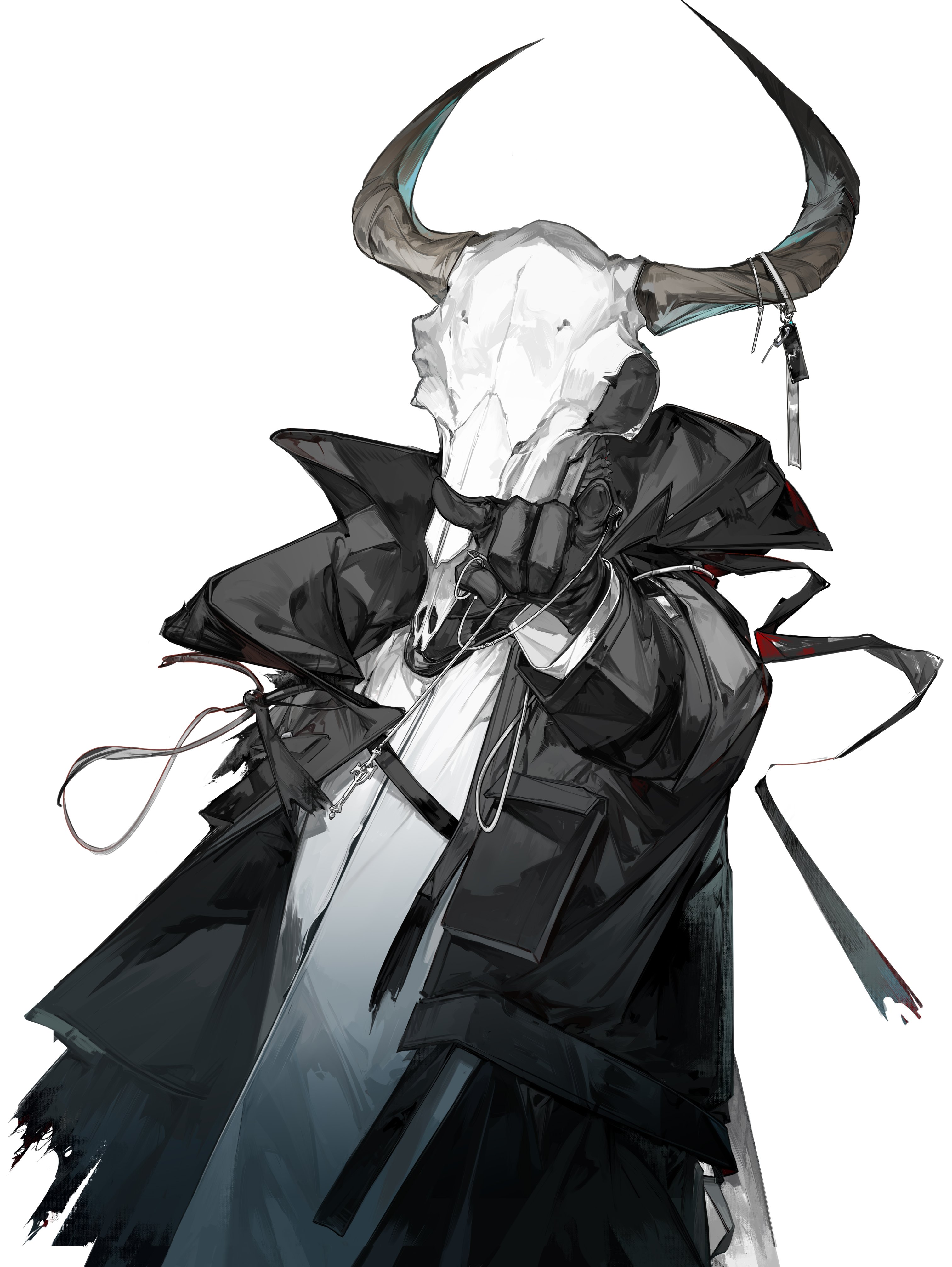 1other absurdres ambiguous_gender animal_skull arknights black_coat black_gloves coat covered_face cow_skull doctor_(arknights) dongsheng gloves highres holding holding_jewelry holding_necklace hood horns jewelry knot necklace open_clothes open_coat shirt simple_background skeleton skull skull_on_head solo standing string unworn_jewelry unworn_necklace upper_body white_background white_shirt