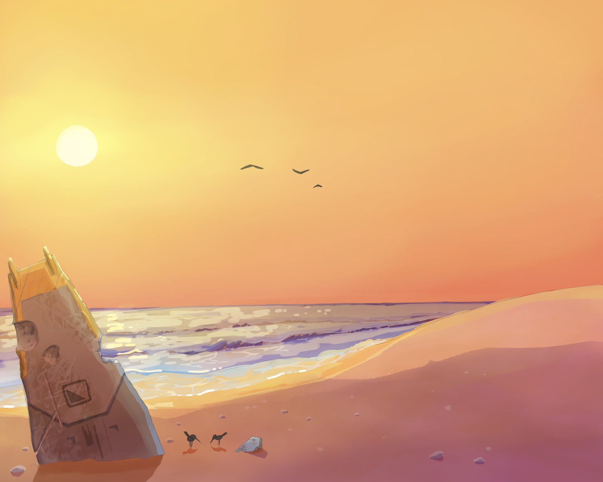 battle_of_titans beach bird cormorant_(battle_of_titans) highres landscape mechabare no_humans ocean orange_sky outdoors scenery science_fiction sky sun vdt waves wreckage
