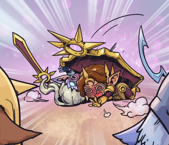 2girls armor blush brown_eyes brown_hair character_request diana_(league_of_legends) falling gold_armor grey_hair league_of_legends leona_(league_of_legends) long_hair lying multicolored_background multiple_girls on_back open_mouth phantom_cross pointy_ears ponytail shield sword weapon yordle