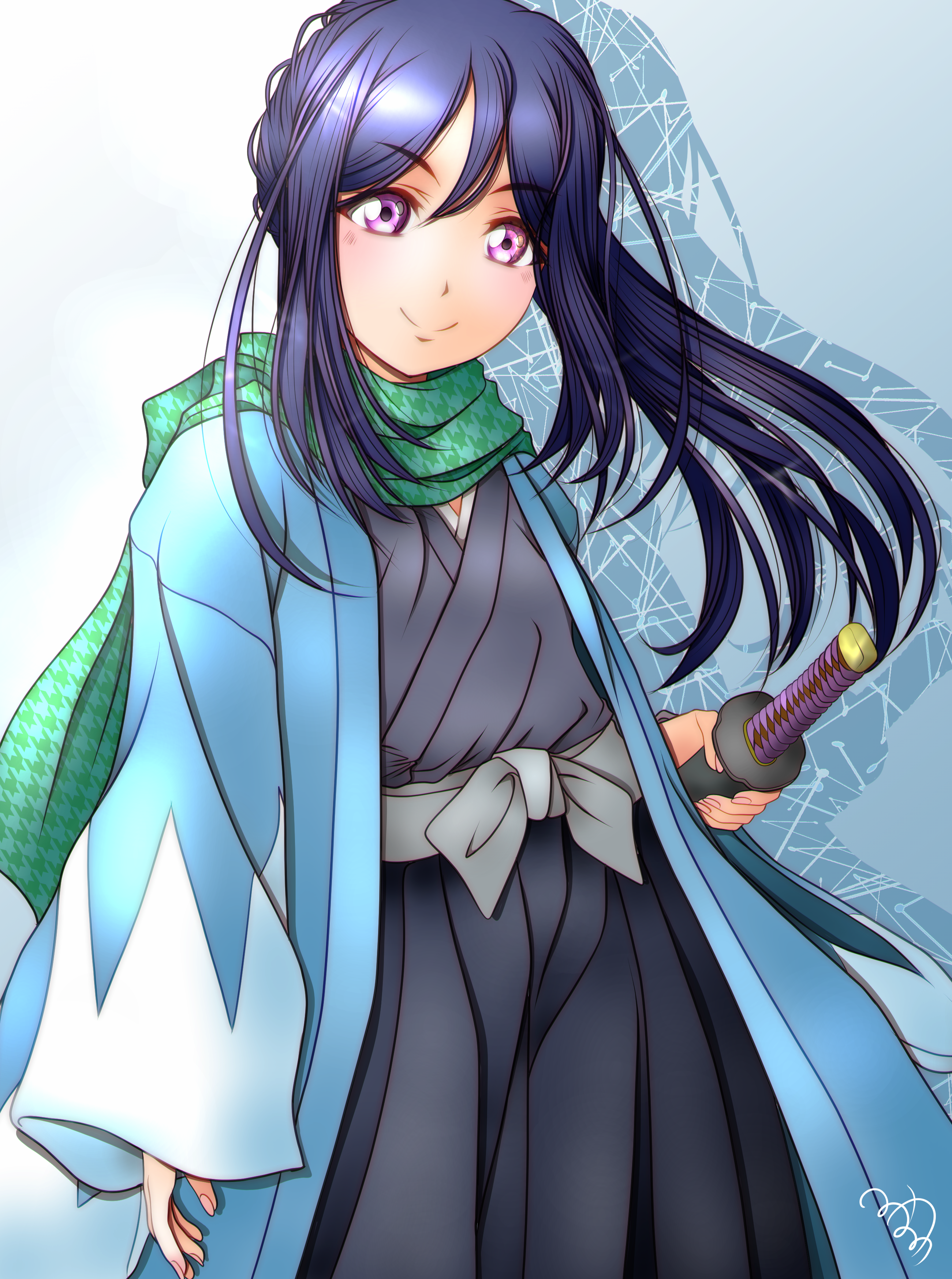 1girl absurdres highres looking_at_viewer love_live! love_live!_sunshine!! matsuura_kanan minami_saan purple_eyes smile solo sword weapon