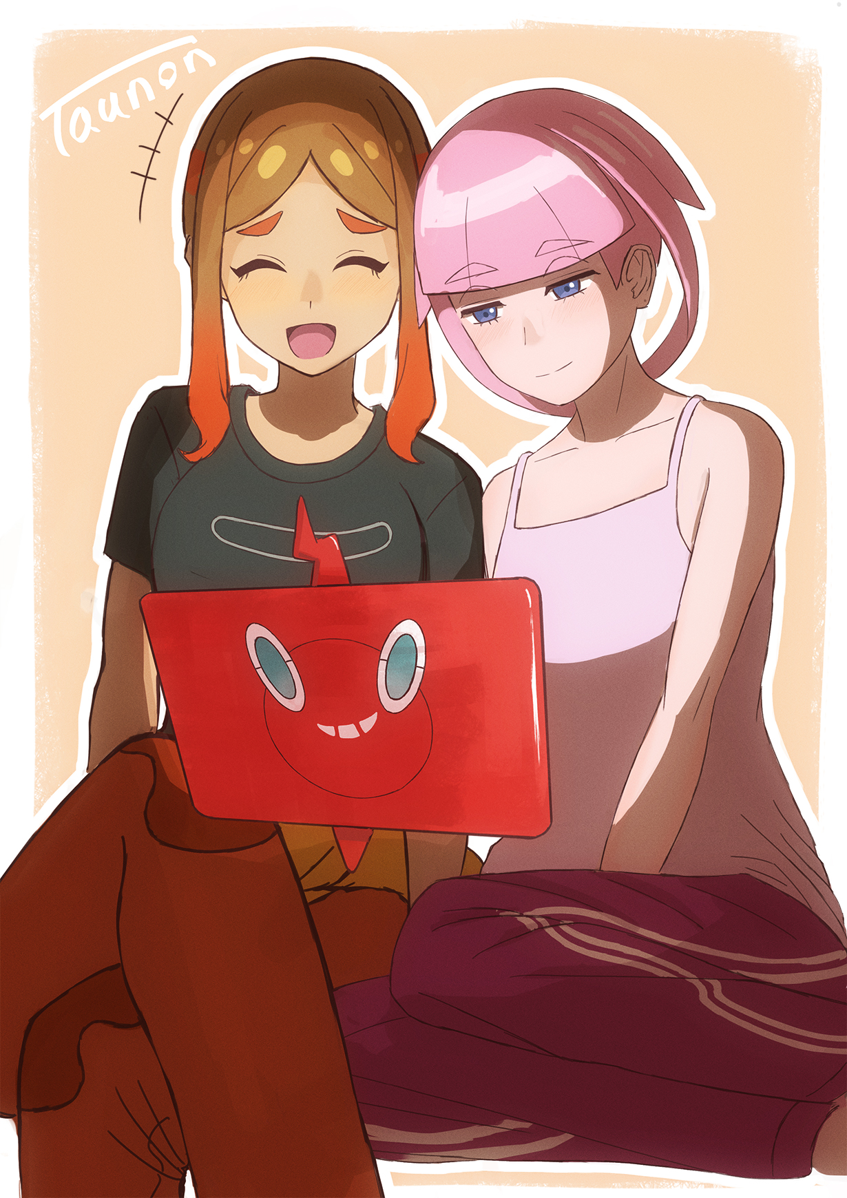 2girls :d artist_name black_shirt brown_hair closed_eyes crossed_legs facing_viewer gen_4_pokemon gradient_hair highres mollie_(pokemon) multicolored_hair multiple_girls nintendo open_mouth orange_pants orla_(pokemon) pants pokemon pokemon_(anime) pokemon_horizons rotom rotom_phone shirt short_sleeves sitting sleeveless sleeveless_shirt smile t-shirt tau_(tau_1111) thick_eyebrows yellow_background