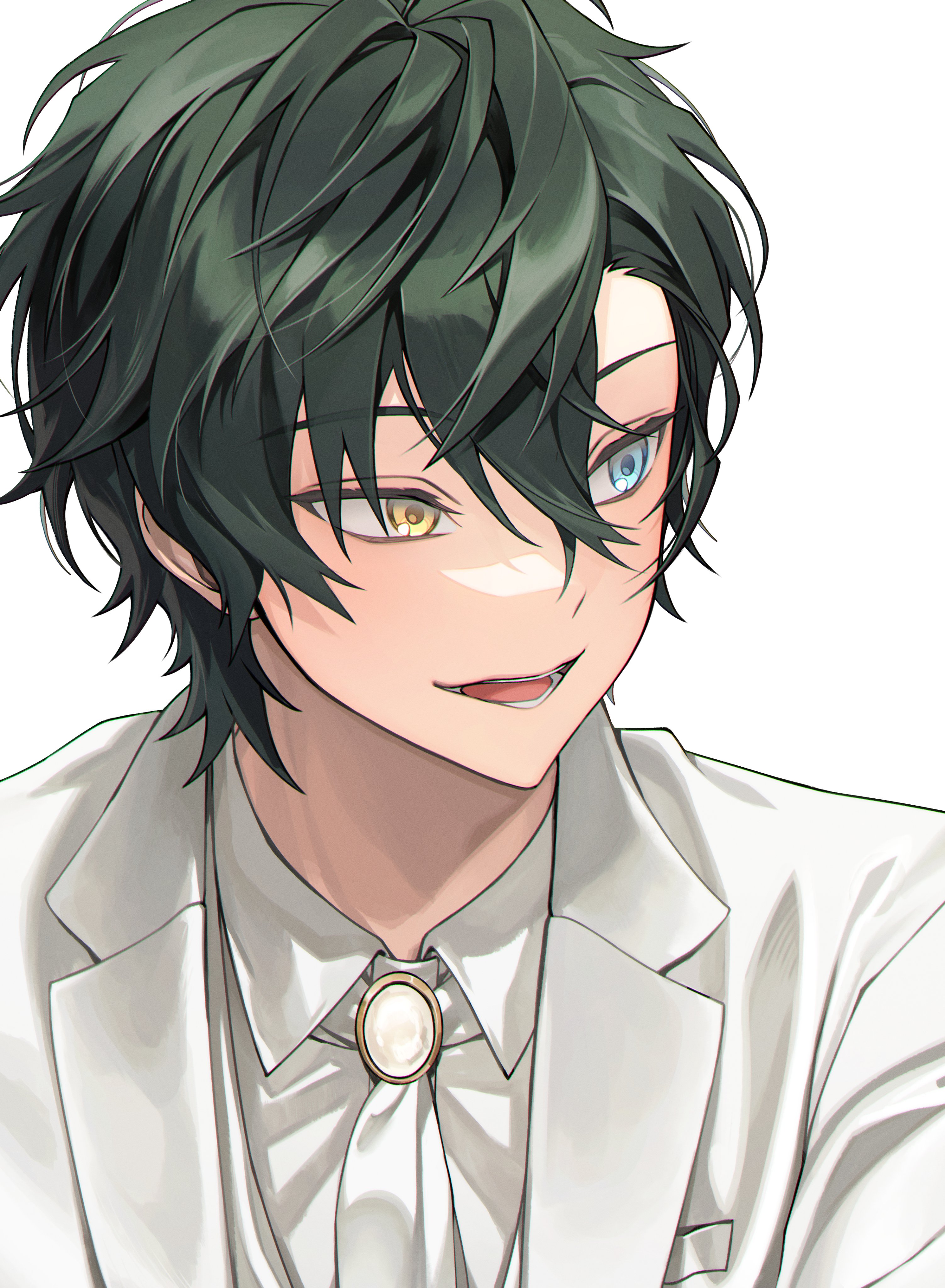 11942tm 1boy absurdres alternate_hairstyle blue_eyes collared_shirt commentary_request ensemble_stars! formal_clothes green_hair hair_between_eyes heterochromia highres jacket kagehira_mika korean_commentary lapels looking_to_the_side male_focus notched_lapels open_mouth portrait shirt short_hair simple_background solo teeth white_background white_jacket yellow_eyes