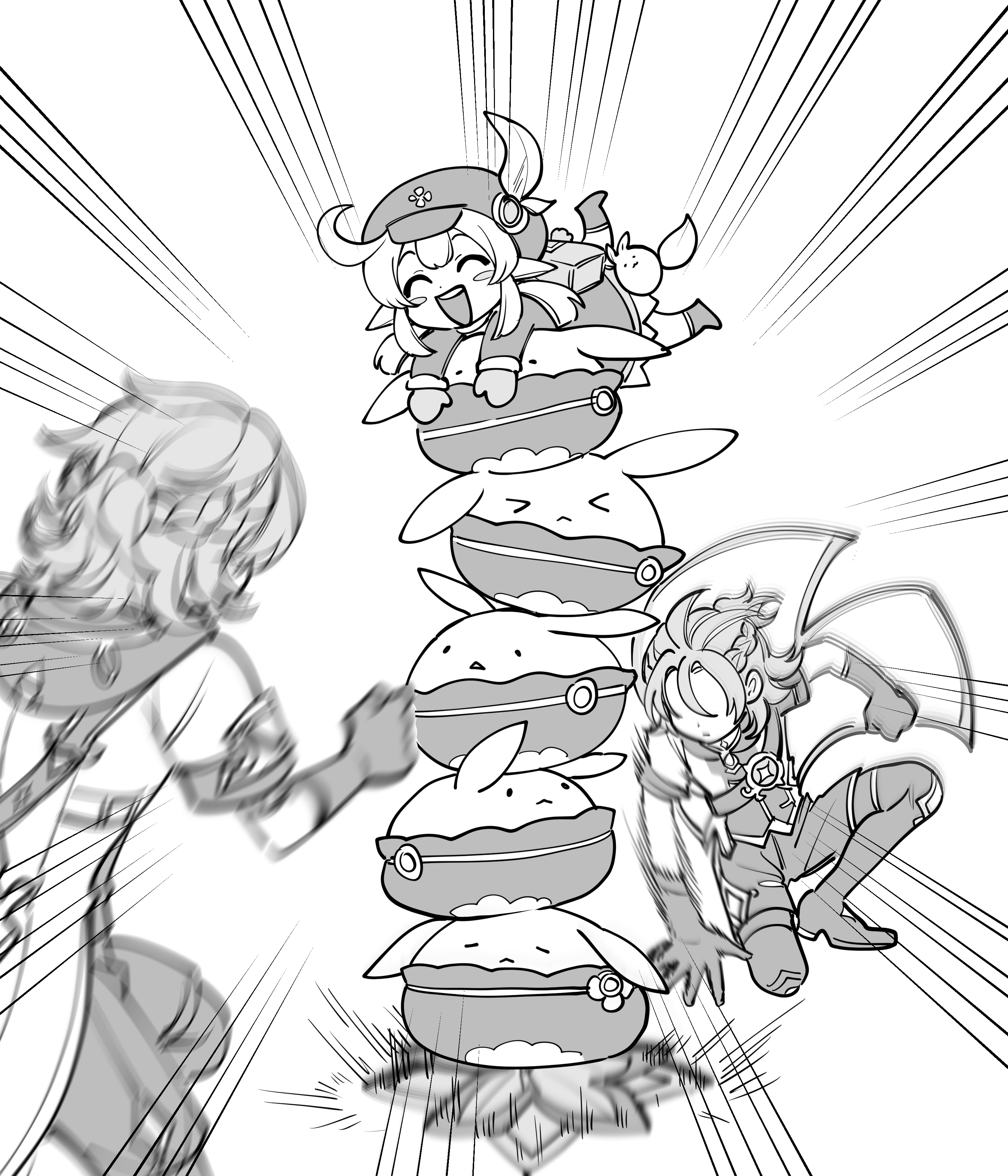 1girl 2boys absurdres ahoge albedo_(genshin_impact) boots braid coat dodoco_(genshin_impact) dress genshin_impact gloves greyscale hat highres impending_doom jumpy_dumpty klee_(genshin_impact) long_sleeves monochrome multiple_boys newsboy_cap pantyhose pillosopi pointy_ears primordial_albedo short_sleeves shorts sidelocks twintails
