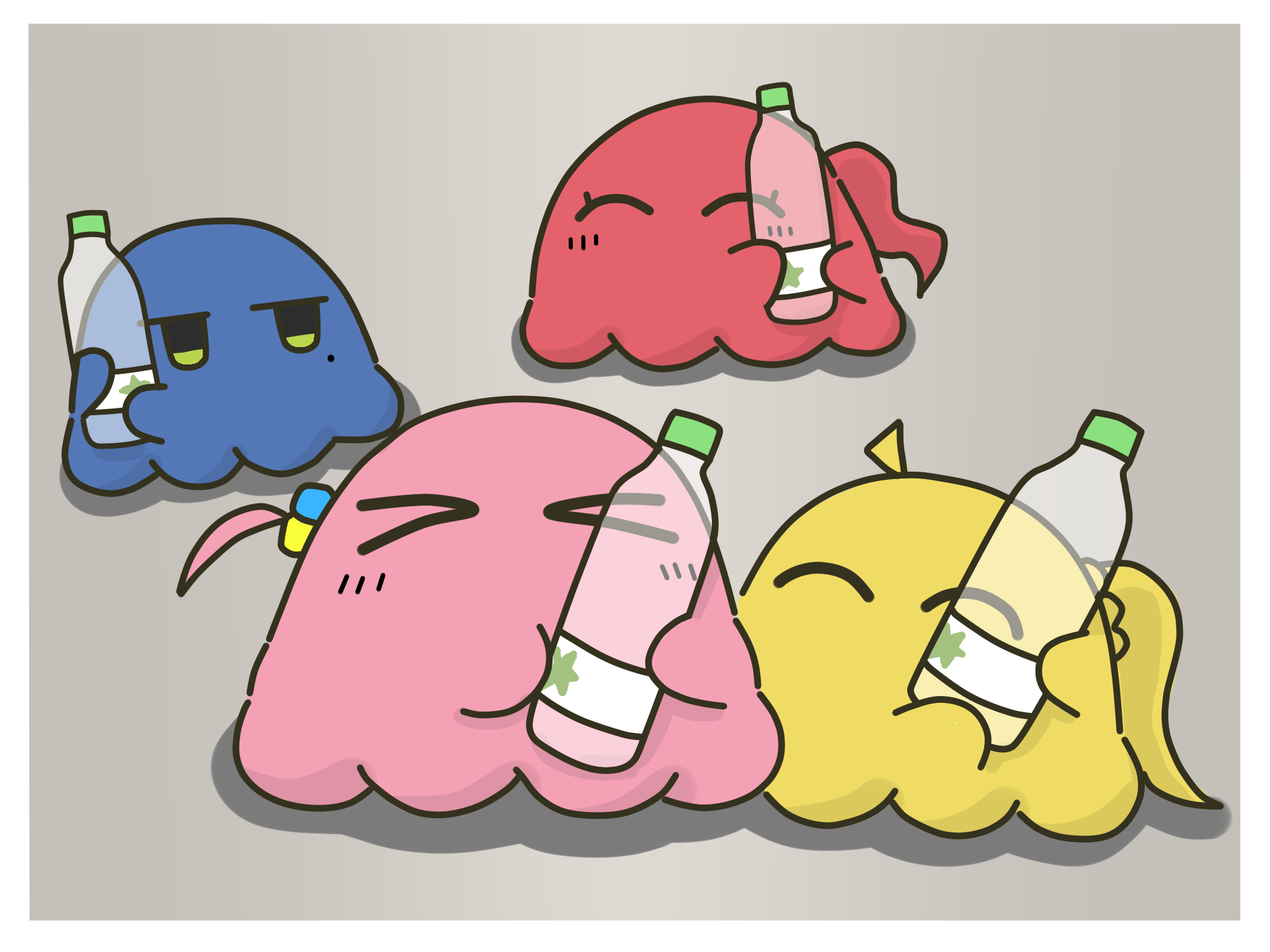 >_< ^_^ ahoge animal_focus animalization bocchi_the_rock! border bottle closed_eyes cube_hair_ornament detached_ahoge facing_viewer gaanetto gotoh_hitori gotoh_hitori_(octopus) grey_background hair_ornament highres holding holding_bottle isshiki_iroha jitome looking_at_another mole mole_under_eye no_humans one_side_up plastic_bottle simple_background white_border