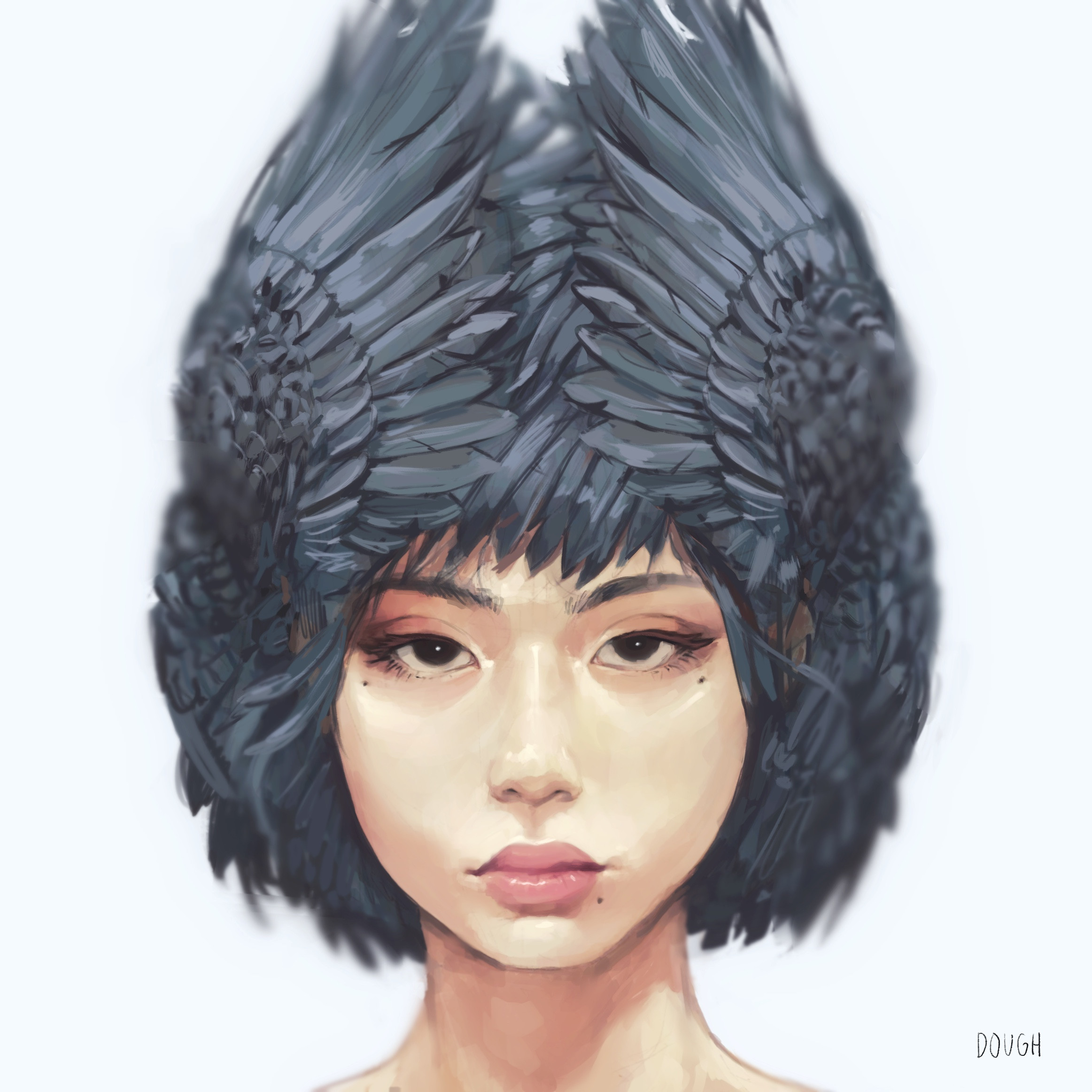 1girl artist_name black_eyes black_hair commentary dough_(doughnath) english_commentary expressionless feathered_wings head_wings highres lips medium_hair mole mole_under_eye mole_under_mouth multiple_moles original portrait realistic signature solo wings