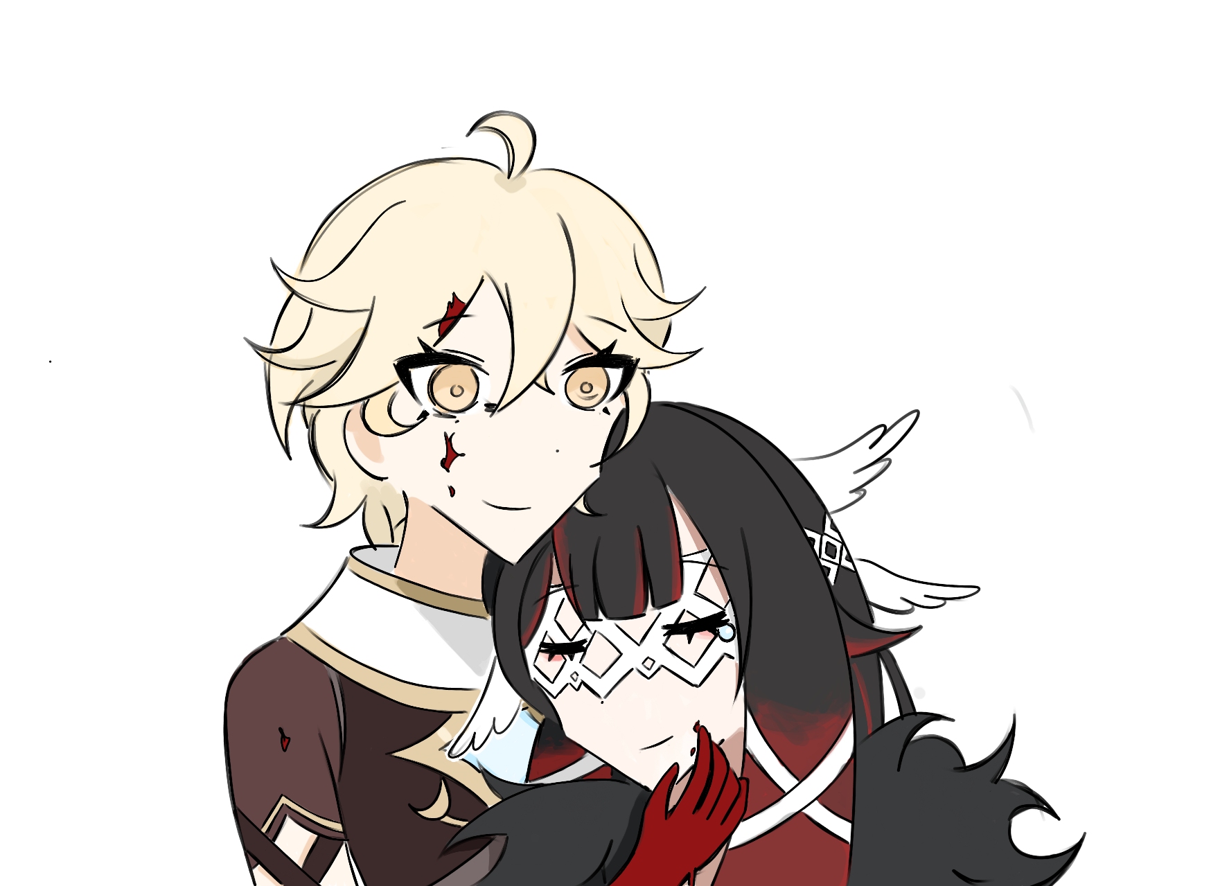 1boy 1girl aether_(genshin_impact) bakenekmoon black_hair blonde_hair blood blood_on_face blood_on_hands closed_eyes columbina_(genshin_impact) feathered_wings genshin_impact gradient_hair happy head_wings highres multicolored_hair orange_eyes pale_skin scarf smile wings