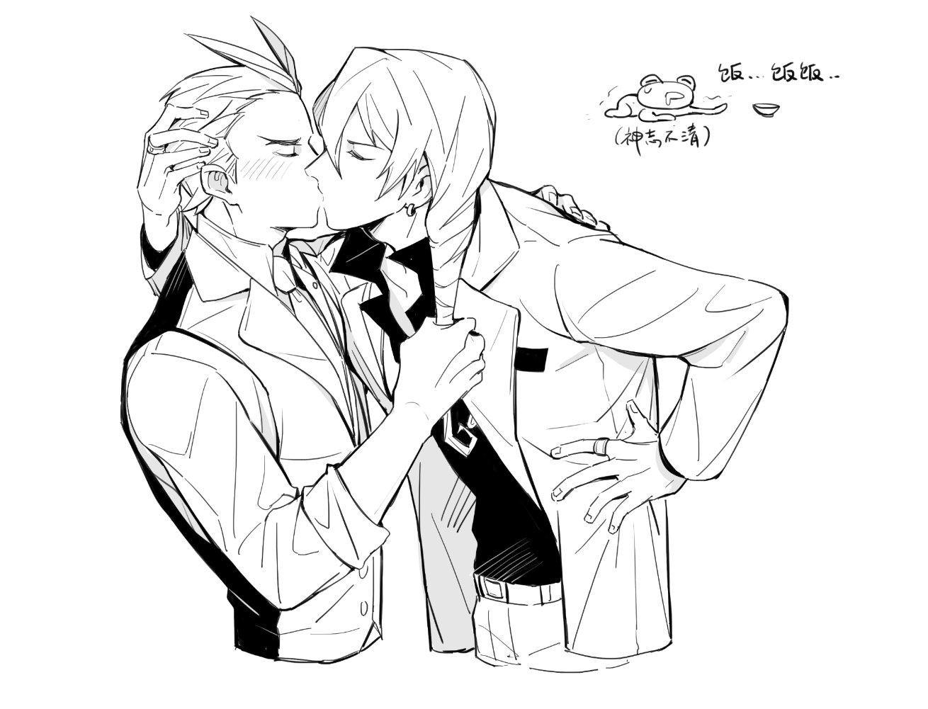 2boys ace_attorney antenna_hair apollo_justice belt blush bowl buttons chinese_text closed_eyes collared_shirt cropped_torso drill_hair earrings fingernails from_side grabbing_another's_hair greyscale hair_between_eyes hand_on_another's_back hand_on_another's_head hand_on_own_hip holding_another's_hair jacket jewelry kaeru_(qingwali) kiss klavier_gavin lapel_pin lapels long_hair long_sleeves male_focus monochrome multiple_boys necktie open_clothes open_collar open_jacket popped_collar profile ring shirt short_hair simple_background sleeves_rolled_up suit_jacket upper_body vest white_background yaoi