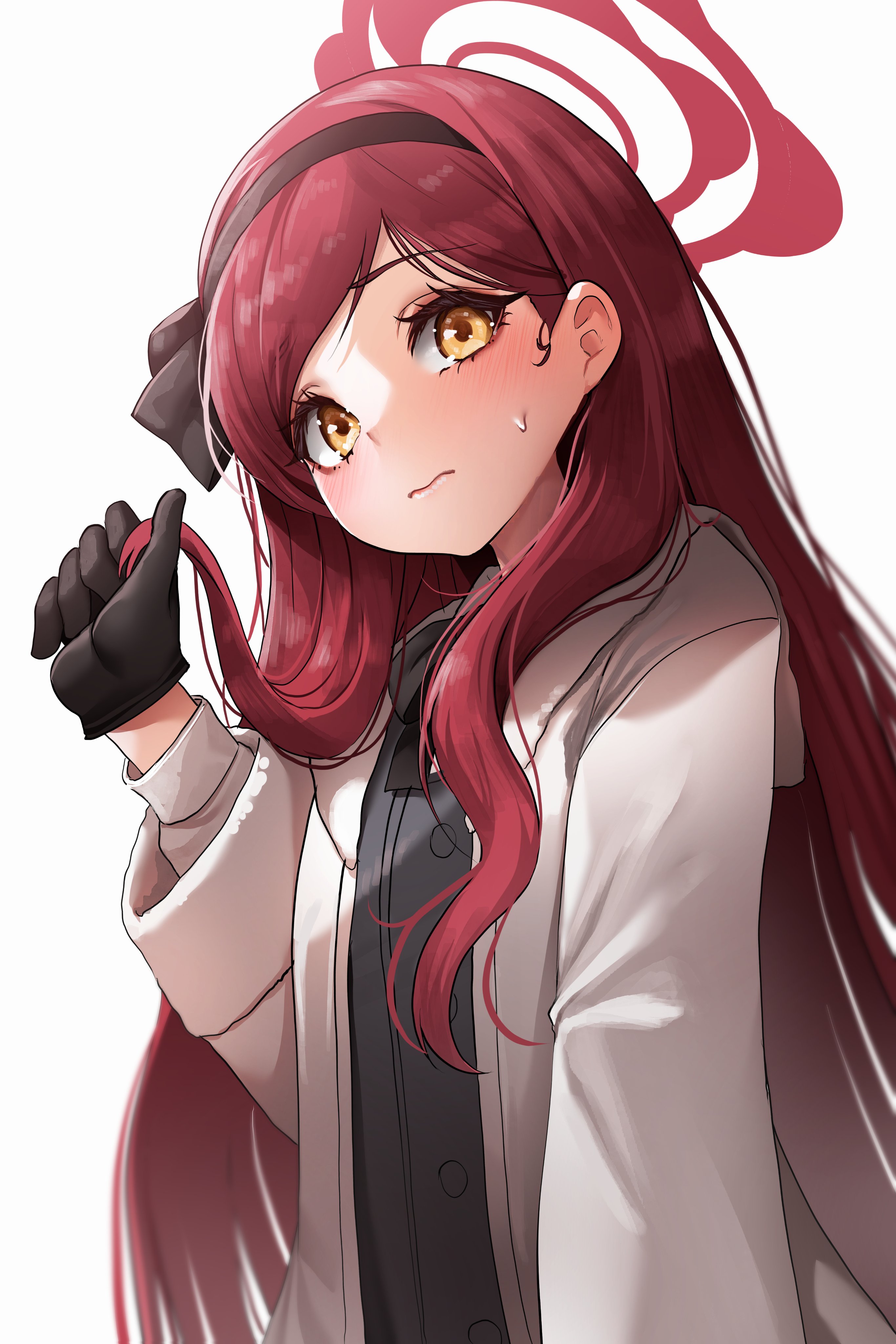 1girl absurdres black_gloves blue_archive coat commentary_request doyoon_7 gloves hairband halo head_tilt highres holding holding_own_hair long_hair long_sleeves looking_at_viewer open_clothes open_coat parted_bangs red_hair school_uniform sidelocks simple_background solo takane_(blue_archive) white_background white_coat yellow_eyes