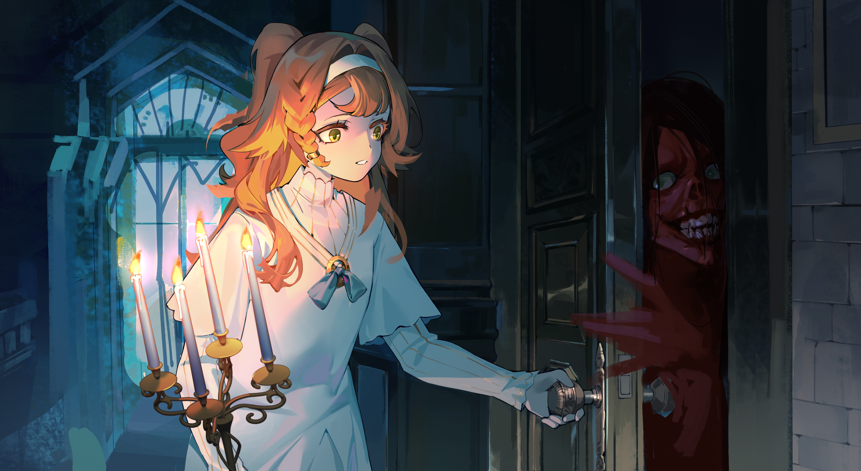 1girl 1other absurdres aged_down beishang_yutou black_hair blue_bow blue_bowtie bow bowtie brick_wall candle candlestand clenched_teeth colored_skin crimson_peak door_handle dress fire green_eyes hairband high_collar highres holding indoors layered_sleeves long_hair long_sleeves looking_at_another monster night opening_door orange_hair red_skin reverse:1999 scared short_over_long_sleeves short_sleeves sonetto_(reverse:1999) teeth two_side_up upper_body white_dress white_hairband window