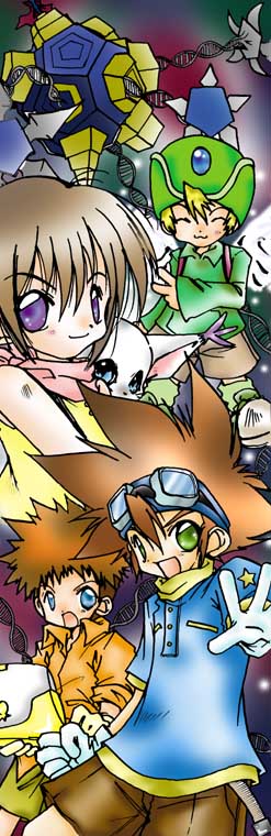apocalymon computer digimon goggles goggles_on_head izumi_koshiro laptop looking_at_viewer smile tailmon takaishi_takeru yagami_hikari yagami_taichi