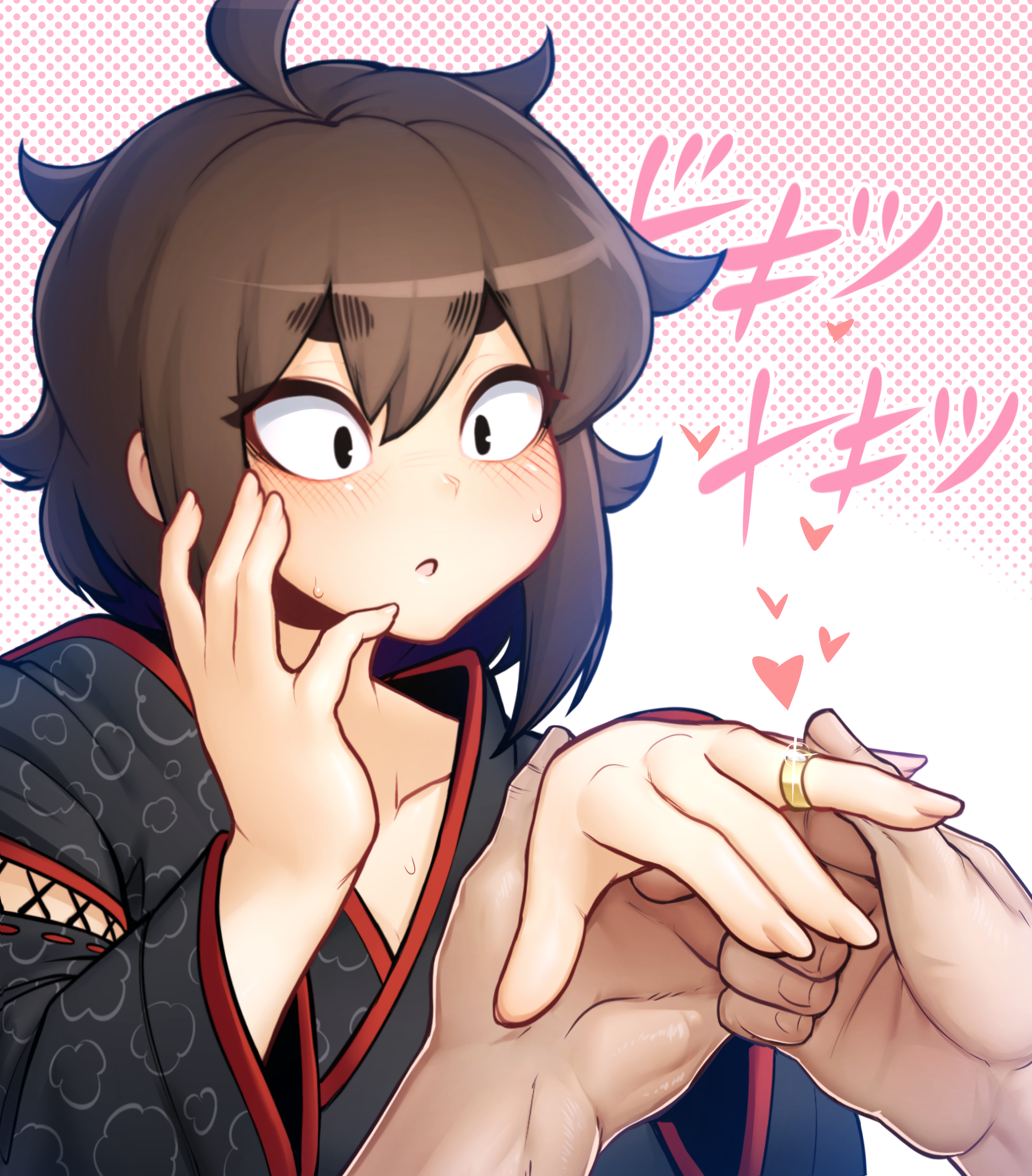 1boy 1girl ash_sarai blush brown_hair collar d-floe disembodied_hand highres jewelry original parted_lips ring sweat thick_eyebrows upper_body