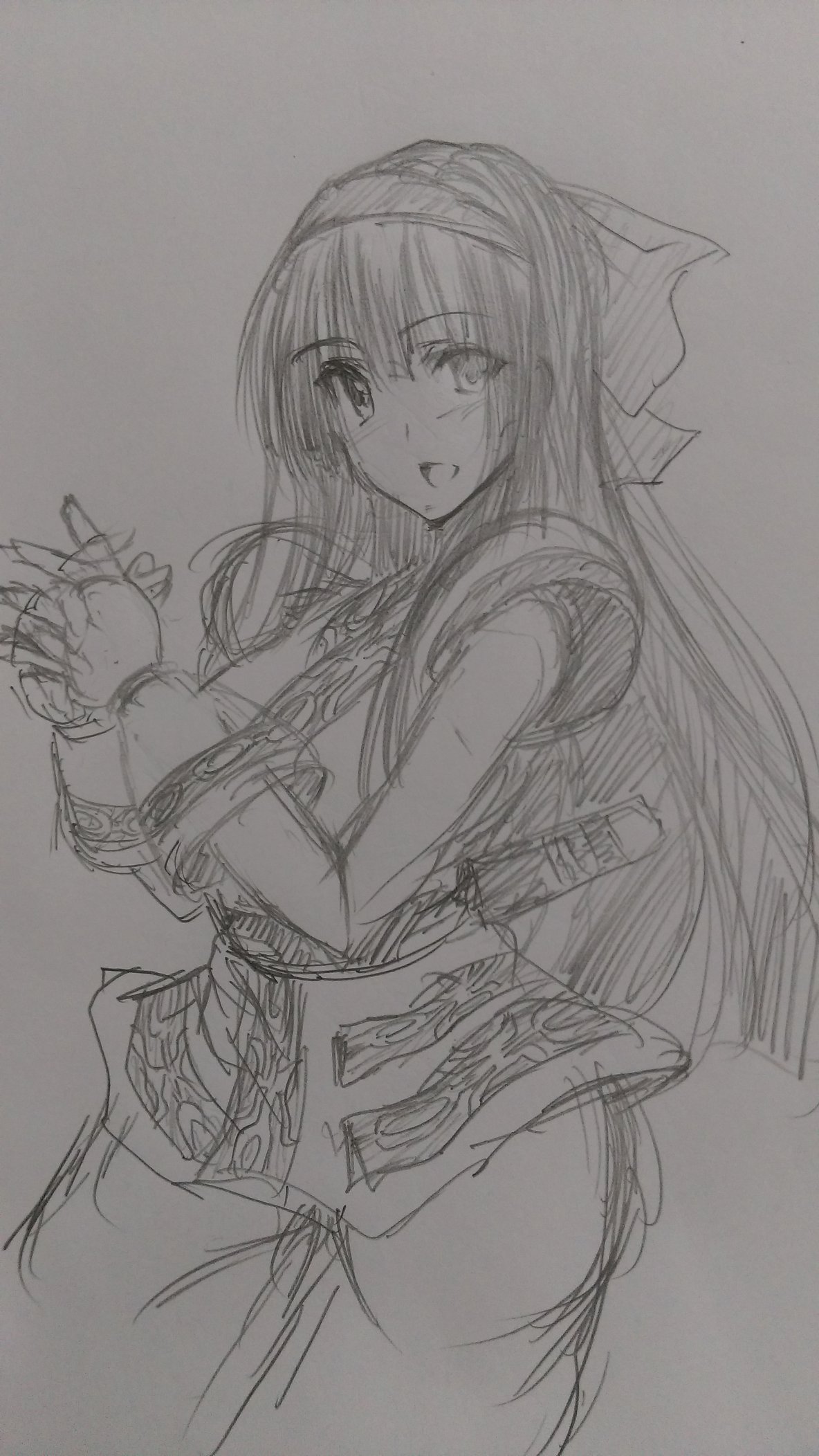 1girl ainu_clothes akenami_yasutaka breasts fingerless_gloves gloves hair_ribbon highres large_breasts legs long_hair looking_at_viewer monochrome nakoruru open_mouth pants ribbon samurai_spirits sketch smile snk the_king_of_fighters the_king_of_fighters_xiv thighs traditional_media weapon