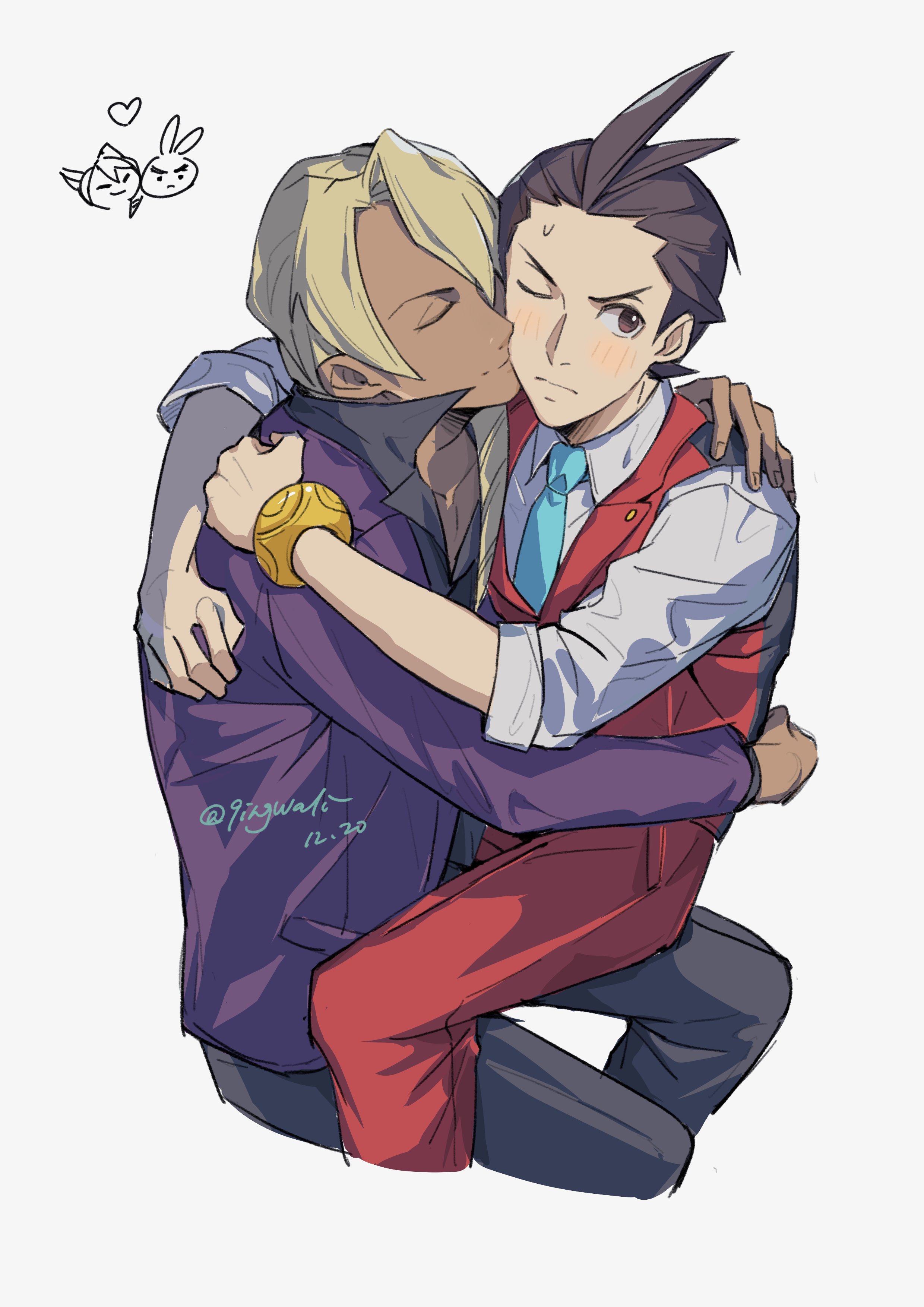 2boys absurdres ace_attorney antenna_hair apollo_justice aqua_necktie black_pants black_shirt blonde_hair blush brown_eyes brown_hair closed_eyes closed_mouth cropped_legs dark-skinned_male dark_skin dated drill_hair formal_clothes hand_on_another's_shoulder heart highres hug jacket kaeru_(qingwali) klavier_gavin lapel_pin lapels long_sleeves male_focus medium_hair multiple_boys necktie one_eye_closed open_collar pants popped_collar purple_jacket red_pants red_suit red_vest shirt simple_background sitting sitting_on_lap sitting_on_person sleeves_rolled_up smile suit sweat swept_bangs twitter_username vest white_background white_shirt yaoi
