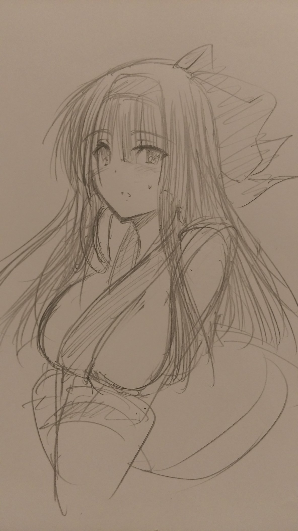 1girl ainu_clothes akenami_yasutaka breasts gloves hair_ribbon highres large_breasts long_hair looking_at_viewer monochrome nakoruru parted_lips ribbon samurai_spirits sketch snk the_king_of_fighters traditional_media