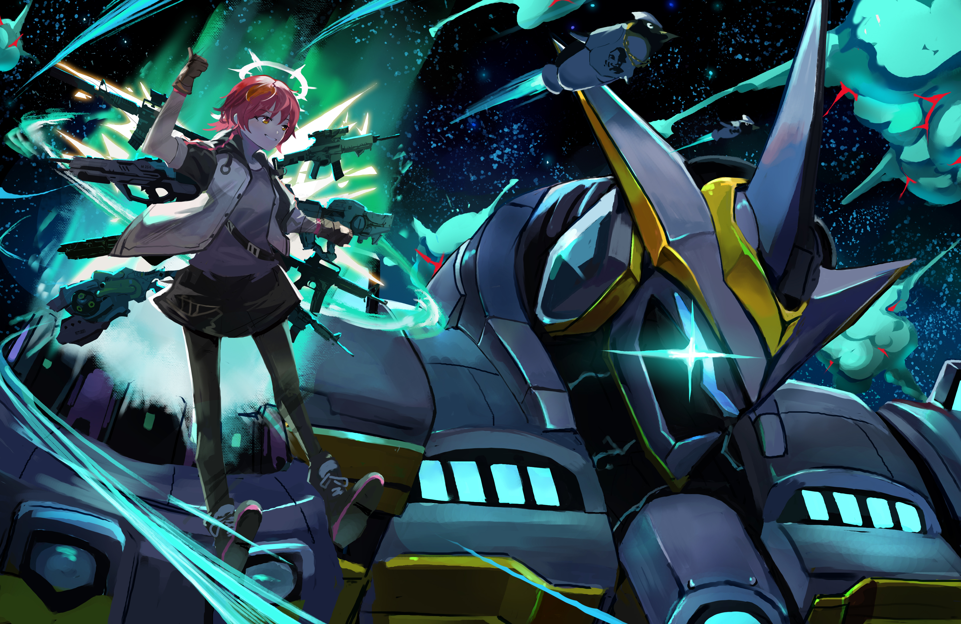 1girl absurdres arknights arm_up chinese_commentary commentary crossover divine_arsenal_aa-zeus_-_sky_thunder duel_monster exusiai_(arknights) floating full_body gloves gun halo highres jacket jiu_ji mecha open_clothes open_jacket red_eyes red_hair robot shoes short_hair short_sleeves skirt weapon yu-gi-oh!