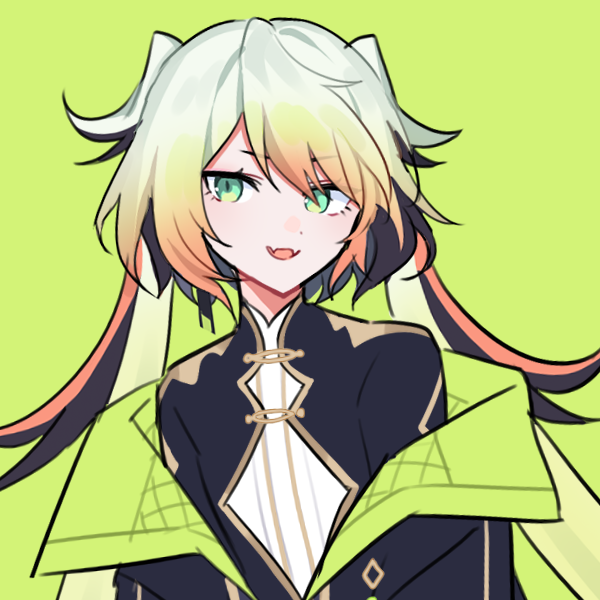 1other black_jacket blonde_hair commentary fangs gradient_hair green_background green_eyes green_hair jacket melissa_kinrenka multicolored_hair nijisanji open_clothes open_jacket open_mouth other_focus simple_background skin_fangs smile solo twintails virtual_youtuber waka_(wk4444)