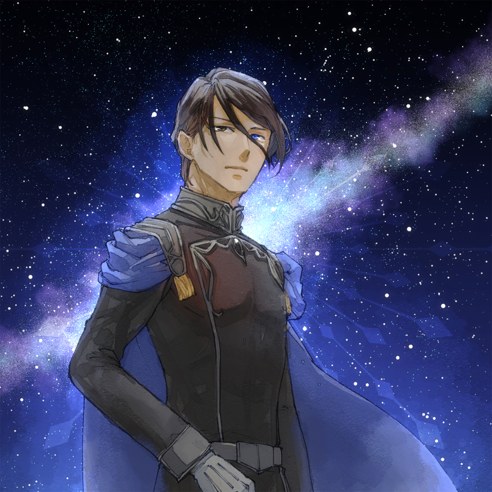 1boy aduma blue_cape blue_eyes brown_eyes brown_hair cape ginga_eiyuu_densetsu heterochromia military_uniform night oskar_von_reuenthal sky space star_(sky) starry_sky