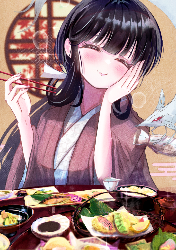 1girl black_hair blush chopsticks closed_eyes commission eating food hand_on_own_face holding holding_chopsticks inuyasha japanese_clothes kikyou_(inuyasha) long_hair seta_(seta105) shinidamachuu skeb_commission