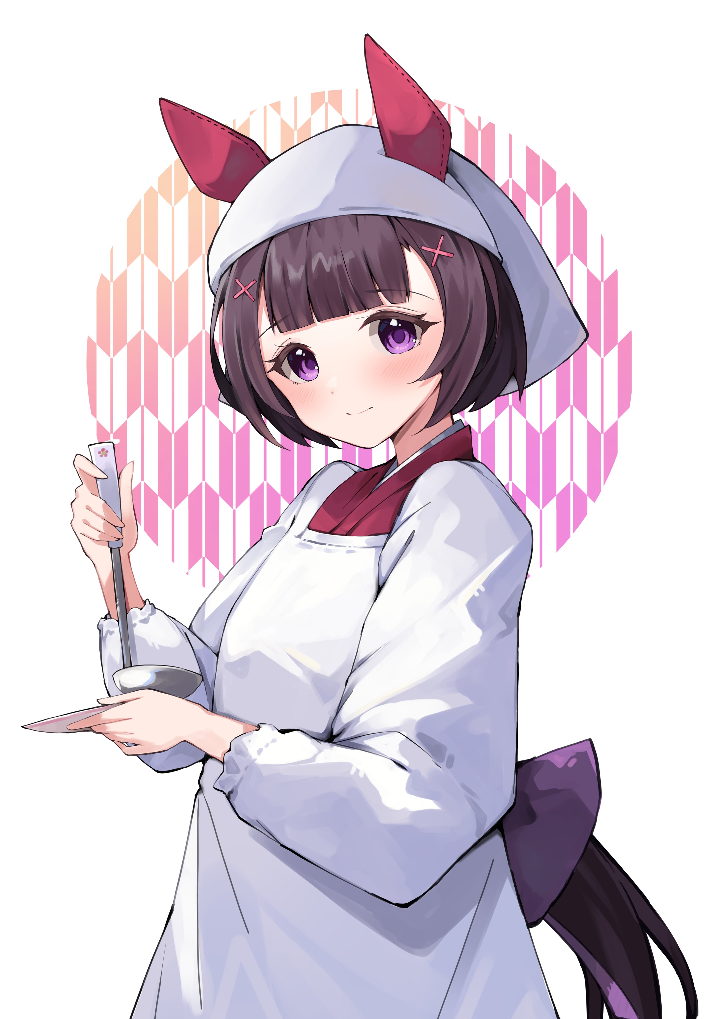 1girl absurdres animal_ears apron blunt_bangs blush bob_cut brown_hair ear_covers ears_through_headwear hair_ornament headscarf highres horse_ears horse_girl horse_tail kappougi looking_at_viewer misonikomi motherly nishino_flower_(umamusume) purple_eyes short_hair smile solo tail tenugui umamusume white_headscarf x_hair_ornament yagasuri
