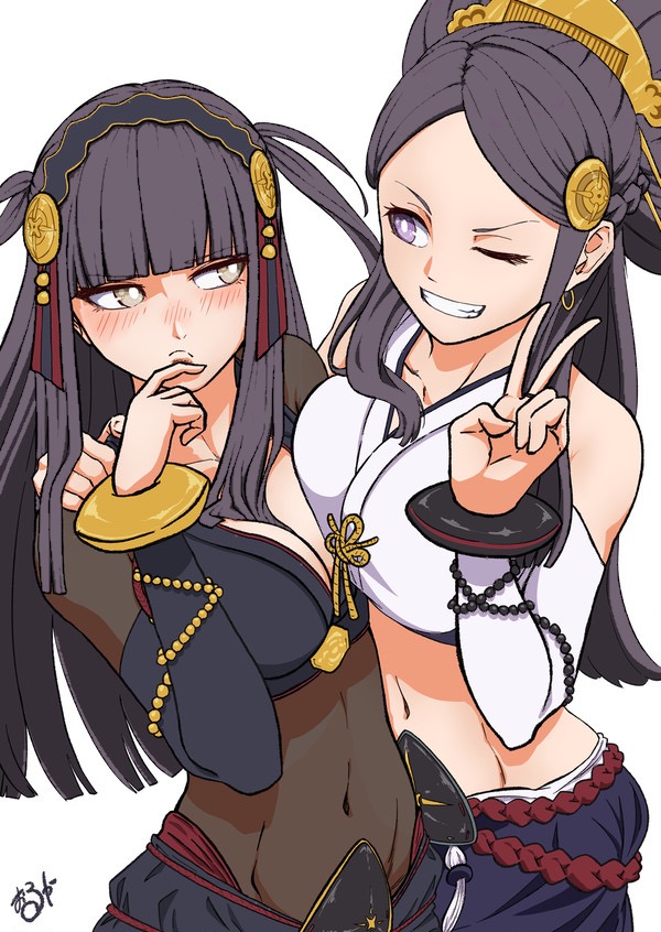 2girls blush breasts cleavage fire_emblem fire_emblem_fates grey_eyes hair_ornament hime_cut japanese_clothes large_breasts midriff mother_and_child mother_and_daughter multiple_girls navel nintendo one_eye_closed orochi_(fire_emblem) oruka parent_and_child purple_eyes purple_hair rhajat_(fire_emblem) wink wolkat