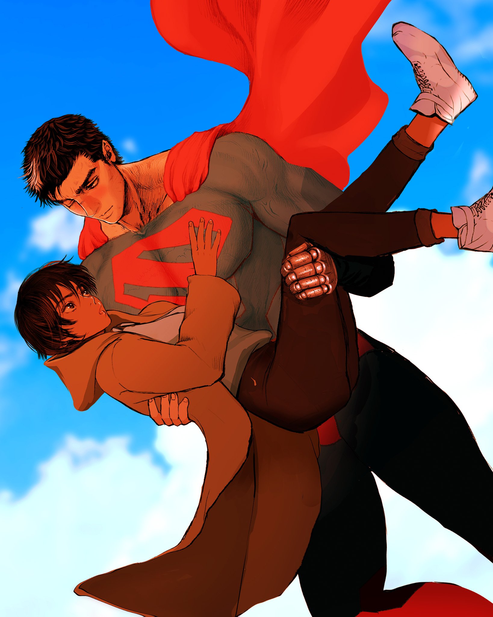 1boy 1girl berserk black_hair blue_sky cape carrying casca_(berserk) cloud cloudy_sky coat cosplay dark-skinned_female dark_skin dc_comics flying guts_(berserk) highres lois_lane lois_lane_(cosplay) my_adventures_with_superman nisino2222 one_eye_closed princess_carry shoes sky sneakers superman superman_(cosplay) superman_(series)