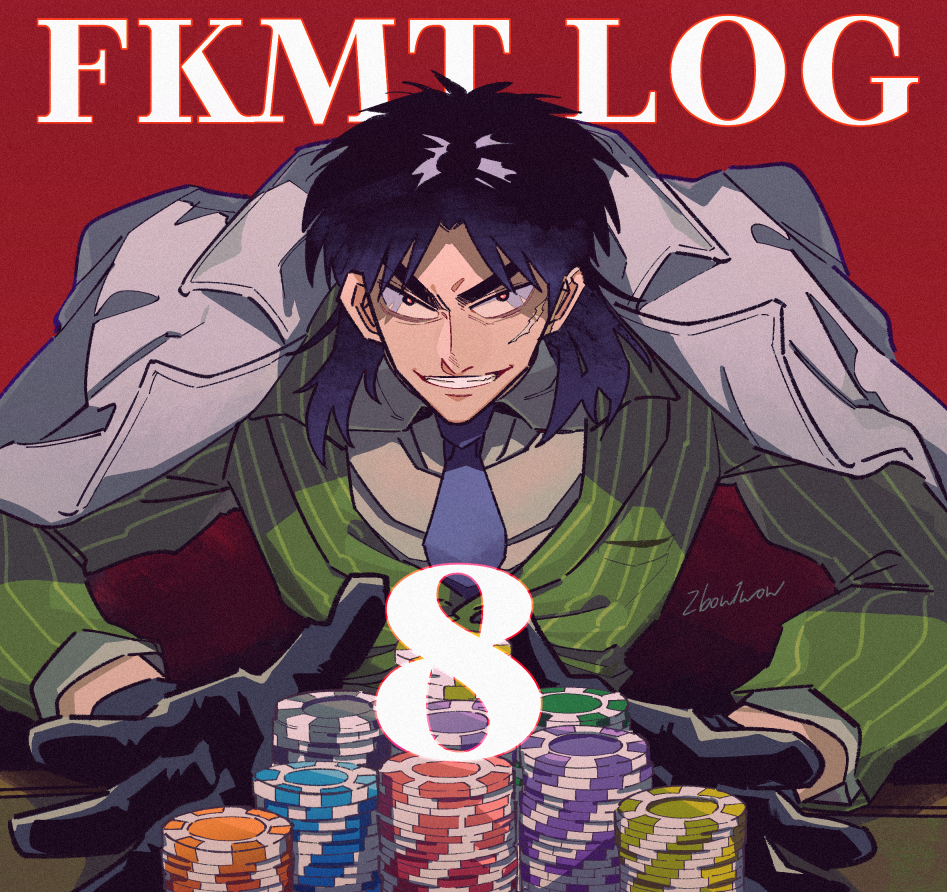 1boy black_eyes black_gloves black_hair black_necktie coat coat_on_shoulders collared_shirt commentary_request facial_scar formal_clothes gloves green_jacket grin inudori itou_kaiji jacket tobaku_mokushiroku_kaiji long_hair looking_at_viewer male_focus necktie parted_bangs poker_chip red_background red_pupils scar scar_on_cheek scar_on_face shirt signature smile solo striped_clothes striped_jacket suit twitter_username upper_body v-shaped_eyebrows vertical-striped_clothes vertical-striped_jacket white_coat white_shirt