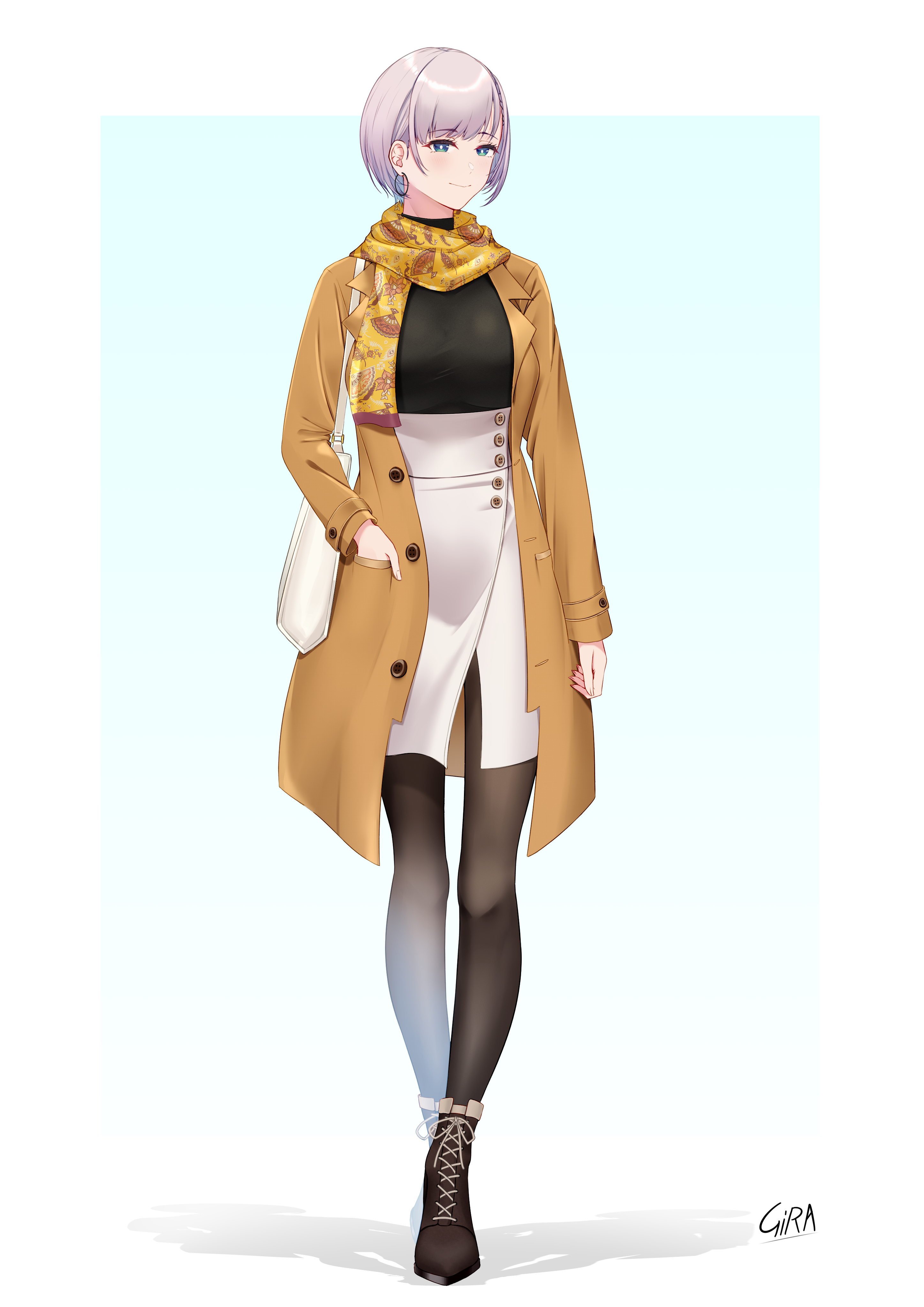 1girl absurdres artist_name bag black_footwear black_pantyhose black_shirt blue_eyes breasts coat earrings fan_print girarikyo grey_hair hand_in_pocket handbag high-waist_skirt highres hololive hololive_indonesia hoop_earrings jewelry medium_breasts pantyhose pavolia_reine scarf shadow shirt short_hair skirt solo virtual_youtuber white_bag white_skirt yellow_coat yellow_scarf