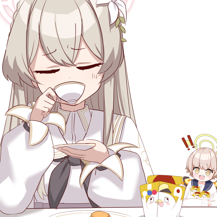 ! !! 2girls :d blue_archive bow braid brown_hair chicken_(food) commentary_request crown_braid cup drinking flower food grey_hair hair_between_eyes hair_bow hair_flower hair_ornament hair_ribbon halo hifumi_(blue_archive) holding holding_cup long_hair long_sleeves looking_at_another low_twintails multiple_girls nagisa_(blue_archive) open_mouth peroro_(blue_archive) ribbon school_uniform serafuku shooka shoulder_strap sidelocks simple_background smile teacup twintails wing_hair_ornament yellow_eyes