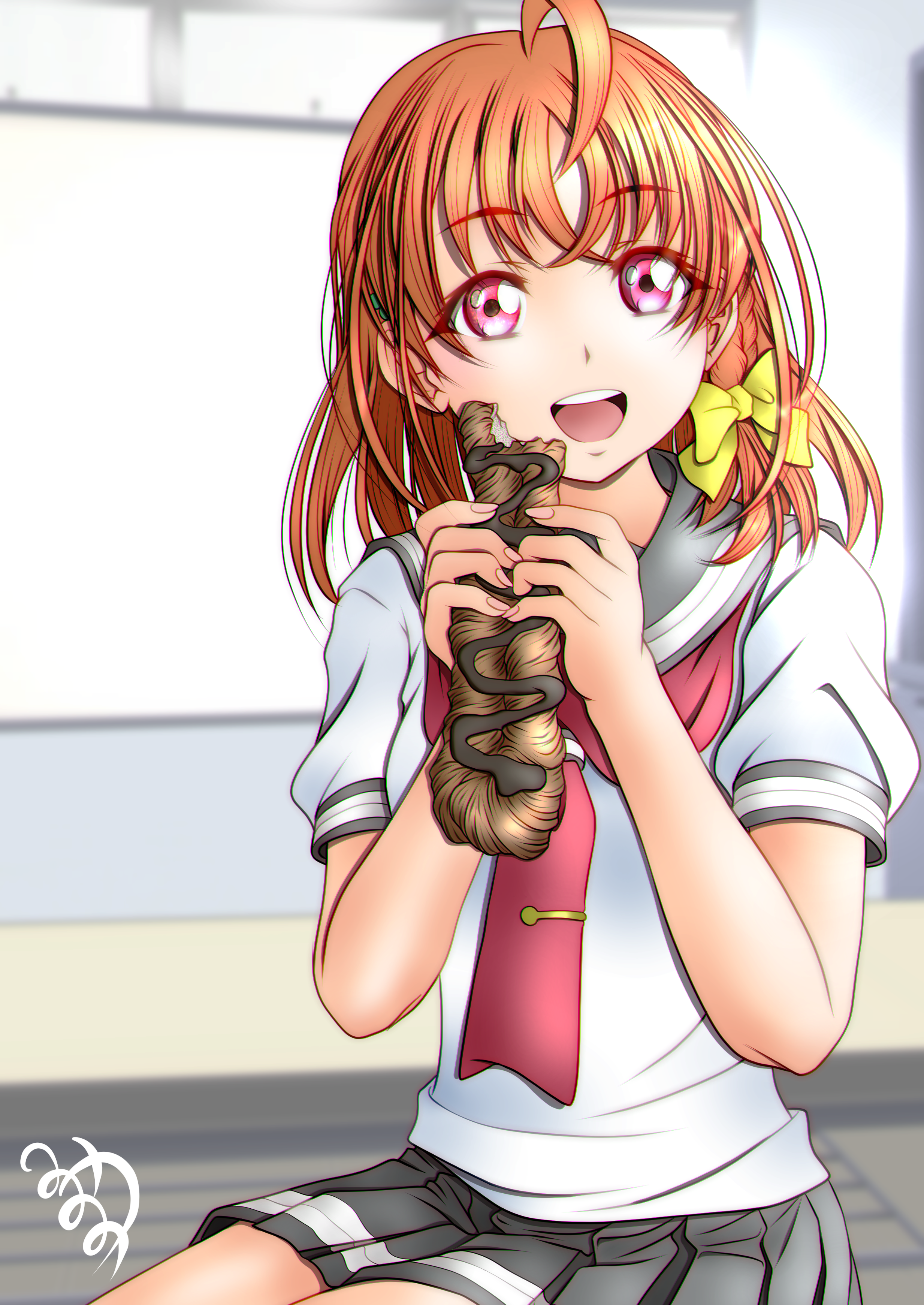 1girl absurdres eating highres looking_at_viewer love_live! love_live!_sunshine!! minami_saan open_mouth orange_hair short_sleeves smile solo takami_chika uranohoshi_school_uniform