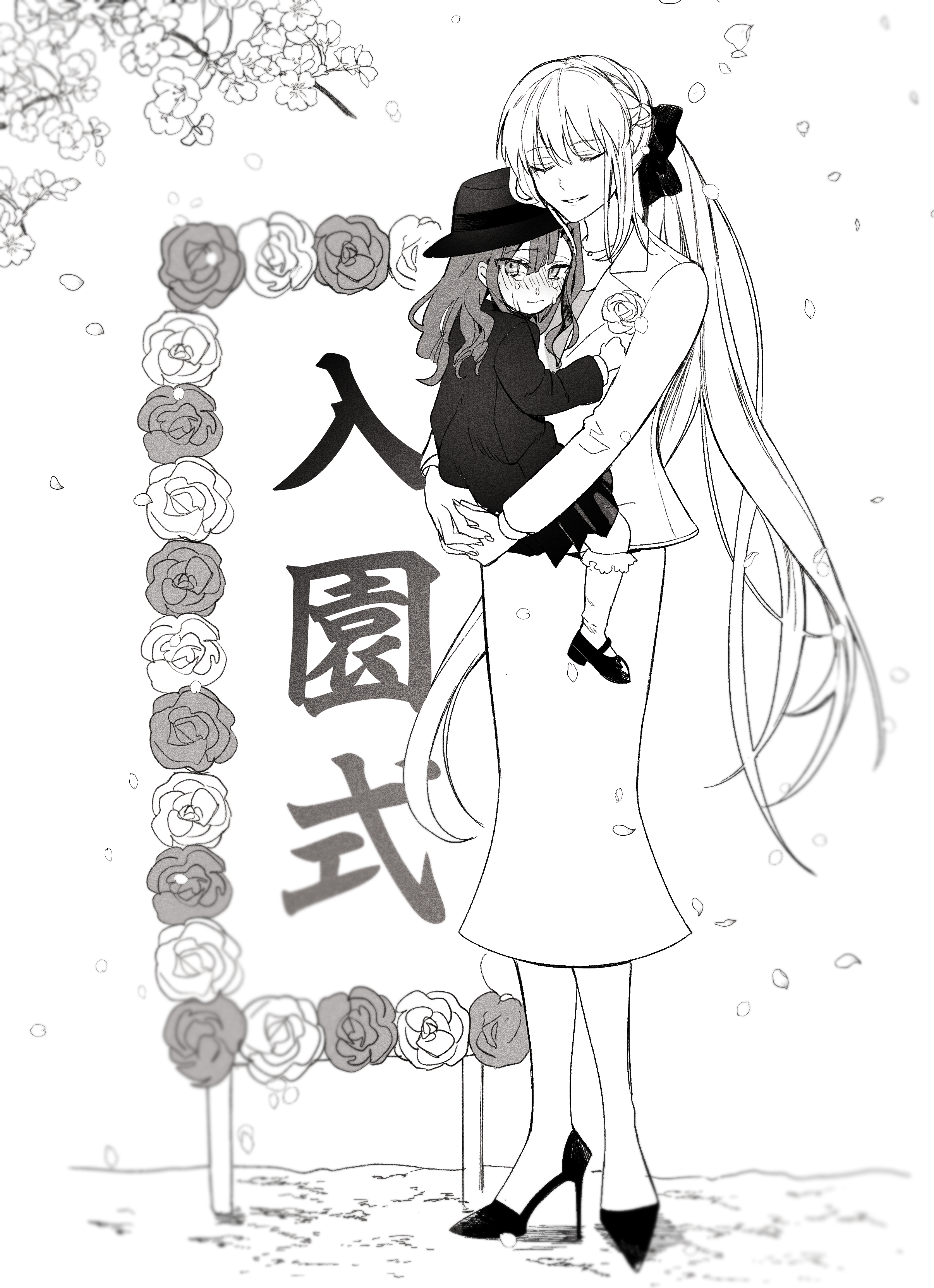 2girls absurdres aged_down baobhan_sith_(fate) blush brooch carrying carrying_person cherry_blossoms closed_eyes crying fate/grand_order fate_(series) flower flower_brooch frilled_socks frills greyscale hair_ribbon hat high_heels highres hug jacket jewelry kindergarten_uniform long_hair long_skirt looking_at_viewer monochrome morgan_le_fay_(fate) mother_and_child mother_and_daughter multiple_girls necklace parent_and_child pleated_skirt ribbon rose ryousuke_(tukr5384) skirt socks swept_bangs tears unhappy very_long_hair