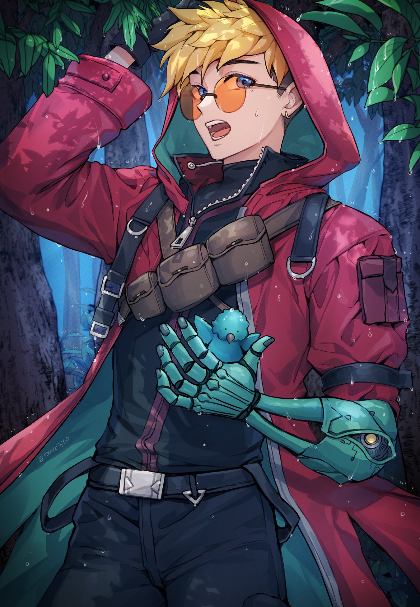 1boy after_rain animal arm_up asymmetrical_sleeves belt bird black_pants black_shirt blonde_hair blue_eyes coat cowboy_shot earrings fanny_pack forest glasses highres holding holding_animal hood hood_up hooded_coat jewelry light_particles long_sleeves looking_at_viewer male_focus mole mole_under_eye nature open_belt open_mouth orange-tinted_eyewear pants pocket prosthesis prosthetic_arm raku7560 red_coat round_eyewear shirt short_hair short_sleeves suspenders_hanging sweat tinted_eyewear trigun trigun_stampede twitter_username undercut vash_the_stampede wet zipper