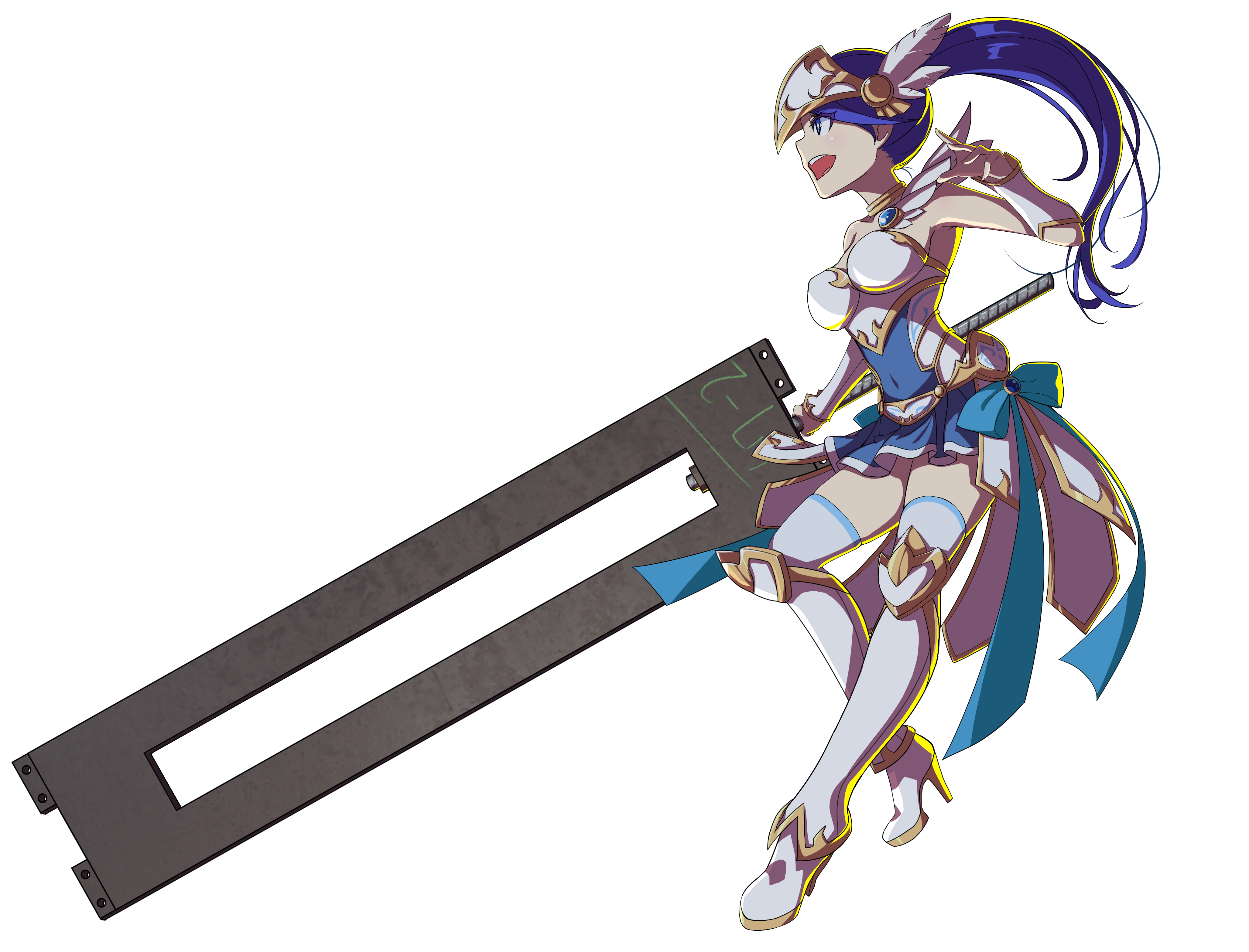 1girl absurdres armor armored_boots artist_request blue_hair boots bow breasts covered_navel feather_hair_ornament full_body hair_ornament highres holding holding_sword holding_weapon huge_weapon jewelry magical_girl magicami medium_breasts miniskirt official_art ohtori_ao ponytail skirt sword thighhighs transparent_background weapon zettai_ryouiki