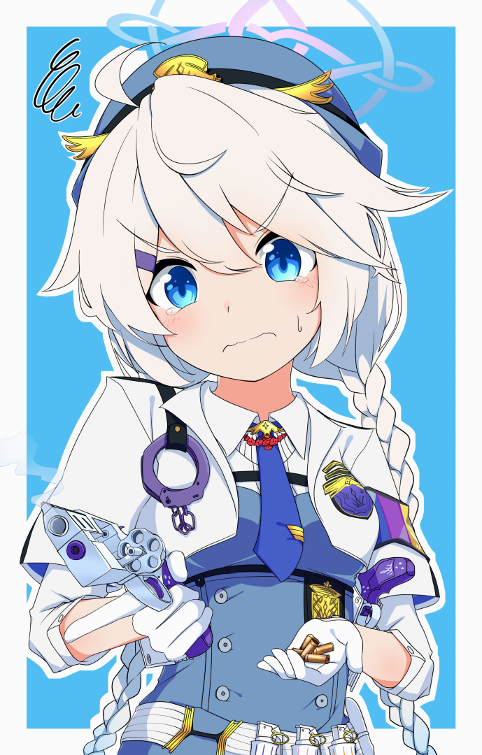 1girl armband blue_archive blue_eyes braid bullet dress epaulettes gloves grey_dress gun halo handgun hat jacket kirino_(blue_archive) kredorf long_hair necktie revolver smith_&_wesson_360 solo swept_bangs twin_braids twintails weapon white_gloves white_hair white_jacket