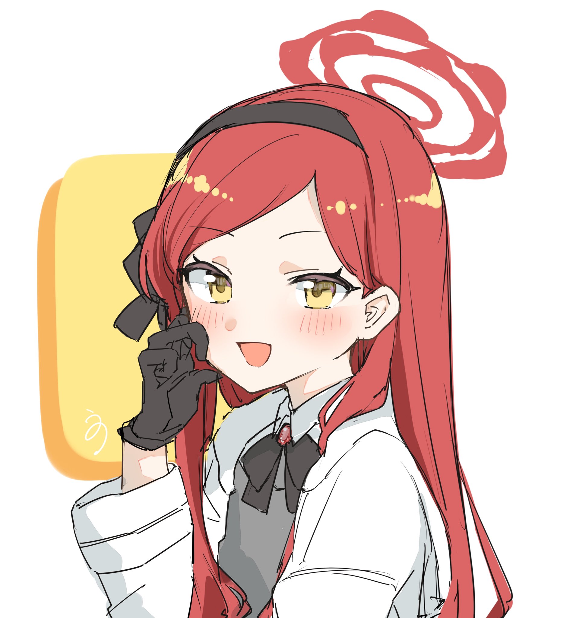1girl black_gloves black_hairband blue_archive blush eyelashes gloves hairband halo highres long_hair long_sleeves looking_at_viewer open_mouth portrait raised_eyebrows red_hair simple_background solo takane_(blue_archive) unot_227 upper_body yellow_eyes