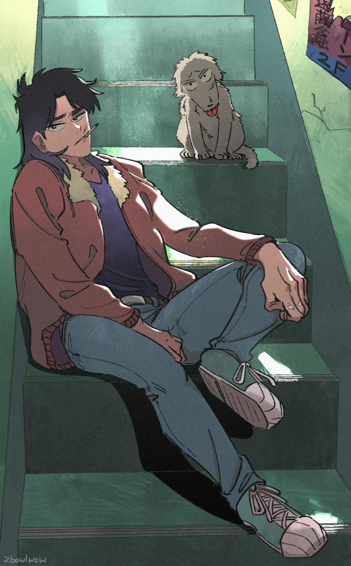 1boy black_eyes black_hair black_shirt blue_pants blue_shoes bomber_jacket brown_jacket cigarette closed_mouth commentary_request dog full_body inudori itou_kaiji jacket tobaku_mokushiroku_kaiji long_hair long_sleeves looking_at_viewer male_focus open_clothes open_jacket pants parted_bangs scar scar_on_hand shirt shoes sitting sitting_on_stairs smoking sneakers solo stairs