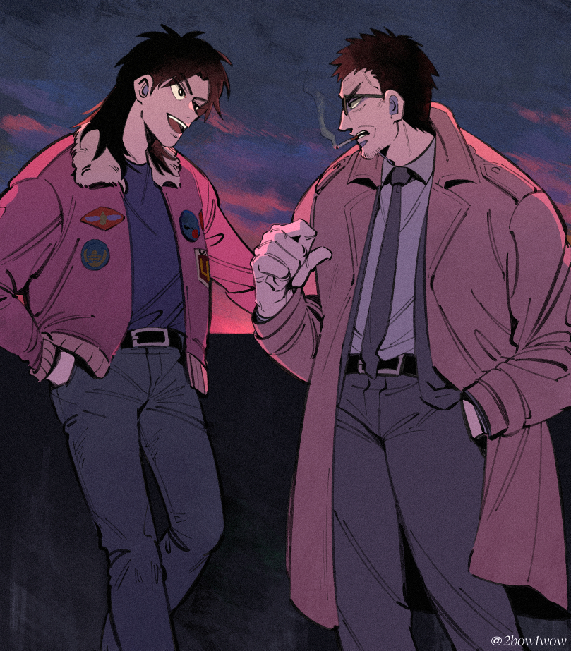 2boys backlighting belt black_belt black_eyes black_hair bomber_jacket brown_coat cigarette cloud coat collared_shirt commentary_request endou_yuuji facial_hair feet_out_of_frame goatee grey_jacket grey_necktie grey_pants grey_shirt hand_in_pocket inudori itou_kaiji jacket tobaku_mokushiroku_kaiji long_hair looking_at_another male_focus multiple_boys necktie open_clothes open_coat open_jacket open_mouth pants parted_bangs patch pink_sky profile shirt short_bangs short_hair sky smile smoke smoking sunglasses sunset teeth upper_teeth_only very_short_hair