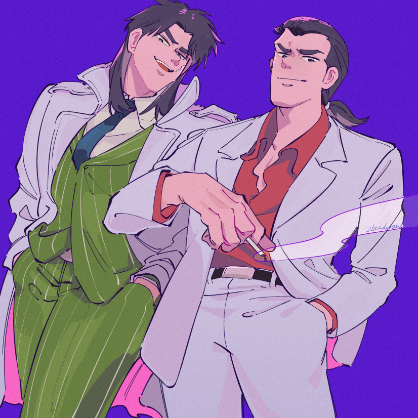 2boys black_eyes black_hair blazer blue_necktie cigarette closed_mouth coat commentary_request cowboy_shot gin_to_kin green_jacket green_pants hair_slicked_back hands_in_pockets holding holding_cigarette inudori itou_kaiji jacket tobaku_mokushiroku_kaiji long_hair long_sleeves looking_at_viewer low_ponytail male_focus medium_hair morita_tetsuo multiple_boys necktie open_clothes open_jacket open_mouth pants parted_bangs ponytail purple_background red_shirt shirt simple_background smile smoke striped_clothes striped_jacket striped_pants teeth upper_teeth_only vertical-striped_clothes vertical-striped_jacket vertical-striped_pants white_coat white_jacket white_pants