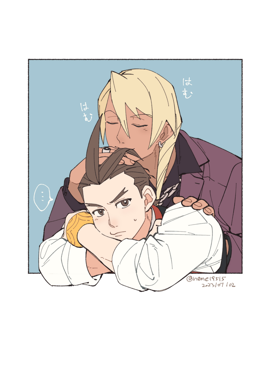 ... 2boys ace_attorney antenna_hair apollo_justice black_shirt blonde_hair blue_background border bracelet brown_eyes brown_hair chain chain_necklace closed_eyes collared_shirt crossed_arms dark-skinned_male dark_skin dated drill_hair earrings fingernails forehead hair_in_another's_mouth hand_on_another's_head hand_on_another's_shoulder head_rest highres jacket jewelry klavier_gavin lapels long_sleeves looking_at_viewer male_focus multiple_boys necklace nennen_(nene19515) open_collar outside_border purple_jacket ring shirt short_hair simple_background sleeves_rolled_up spoken_ellipsis sweat swept_bangs v-shaped_eyebrows white_border white_shirt yaoi