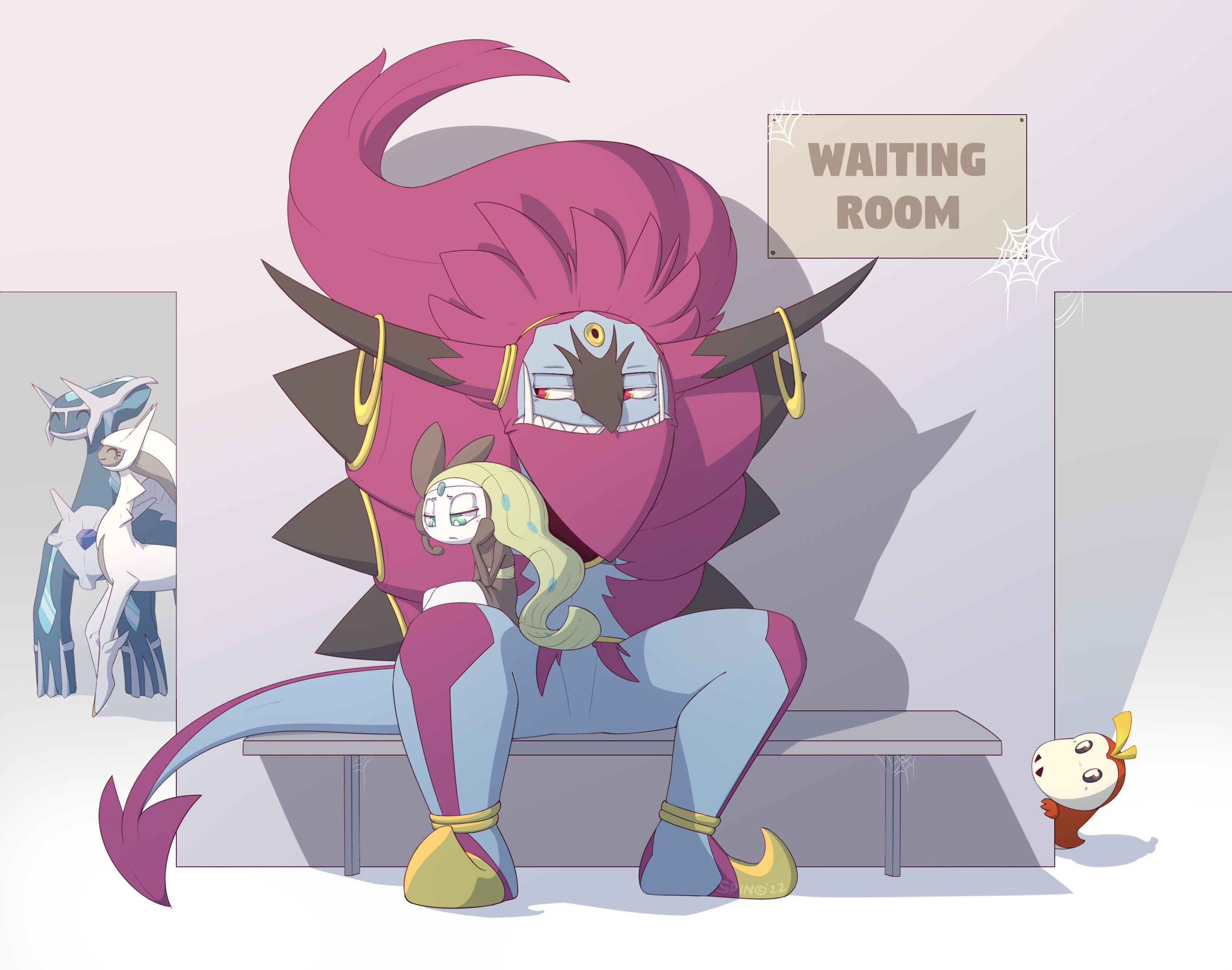 1girl 6+others arceus creepy dialga earrings english_text fuecoco gen_4_pokemon gen_5_pokemon gen_6_pokemon grin highres hoop_earrings hoopa hoopa_(unbound) horns jewelry legendary_pokemon looking_at_another looking_to_the_side meloetta meloetta_(aria) multiple_boys multiple_others mythical_pokemon nintendo no_humans pokemon pokemon_(creature) portal_(object) red_eyes sharp_teeth sitting smile spino_(spinoone) spirit teeth