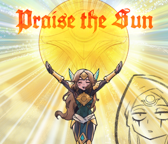 2girls armor arms_up black_gloves blush brown_hair closed_eyes commentary covered_navel crescent crescent_facial_mark diana_(league_of_legends) dust english_text facial_mark forehead_mark full_armor gloves hair_ornament league_of_legends leona_(league_of_legends) light_particles long_hair multiple_girls open_mouth parted_bangs phantom_cross praise_the_sun shurima_(league_of_legends) smile standing sun untranslatable_commentary
