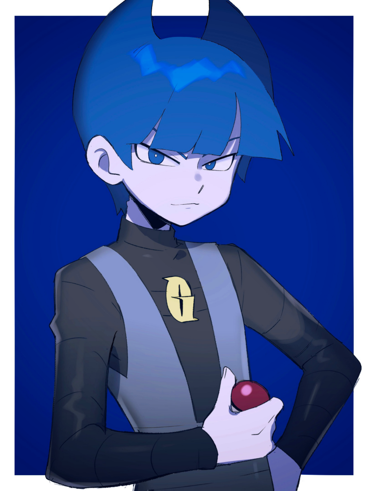 1boy a_(poipiku_325815) black_shirt blue_background blue_eyes blue_hair blunt_bangs border closed_mouth commentary_request hand_on_own_hip holding holding_poke_ball logo long_sleeves looking_at_viewer male_focus nintendo poke_ball poke_ball_(basic) pokemon pokemon_dppt saturn_(pokemon) shirt short_hair smile solo team_galactic team_galactic_uniform upper_body white_border