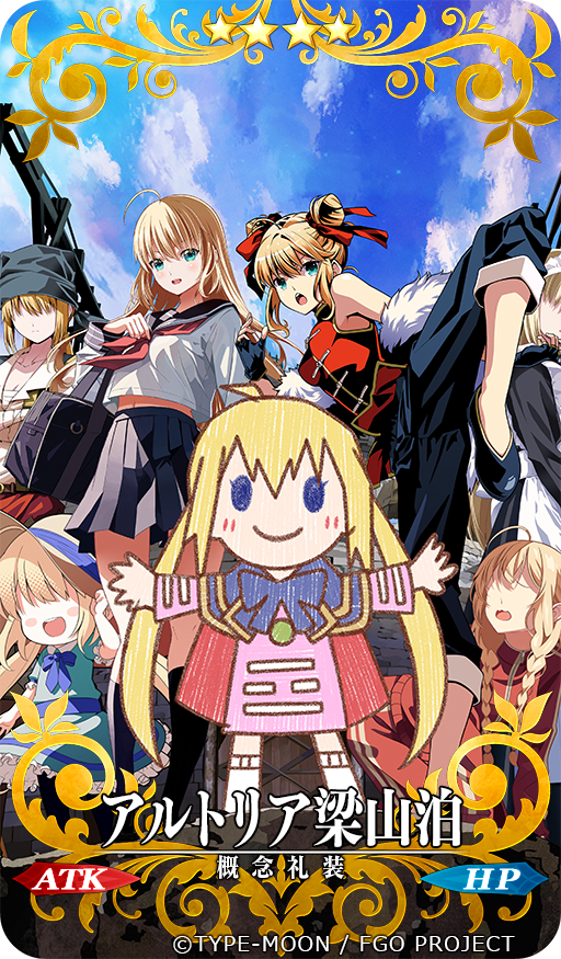 6+girls aged_down ahoge apron artoria_caster_(fate) artoria_pendragon_(fate) bag blue_eyes blue_sky blush_stickers bow breasts budget_sarashi chibi chinese_clothes commentary_request craft_essence_(fate) double_bun dress fate/grand_order fate_(series) fingerless_gloves gloves hair_between_eyes hair_bun hair_over_eyes hair_ribbon hand_on_headwear hat leg_up long_hair long_sleeves maid maid_apron maid_headdress multiple_girls multiple_persona navel neckerchief official_art open_mouth pants pleated_skirt ribbon sailor_collar sailor_shirt sarashi school_bag school_uniform serafuku shirt short_sleeves skirt sky sleeveless small_breasts smile sun_hat track_suit translation_request tsukumo_(soar99) twintails